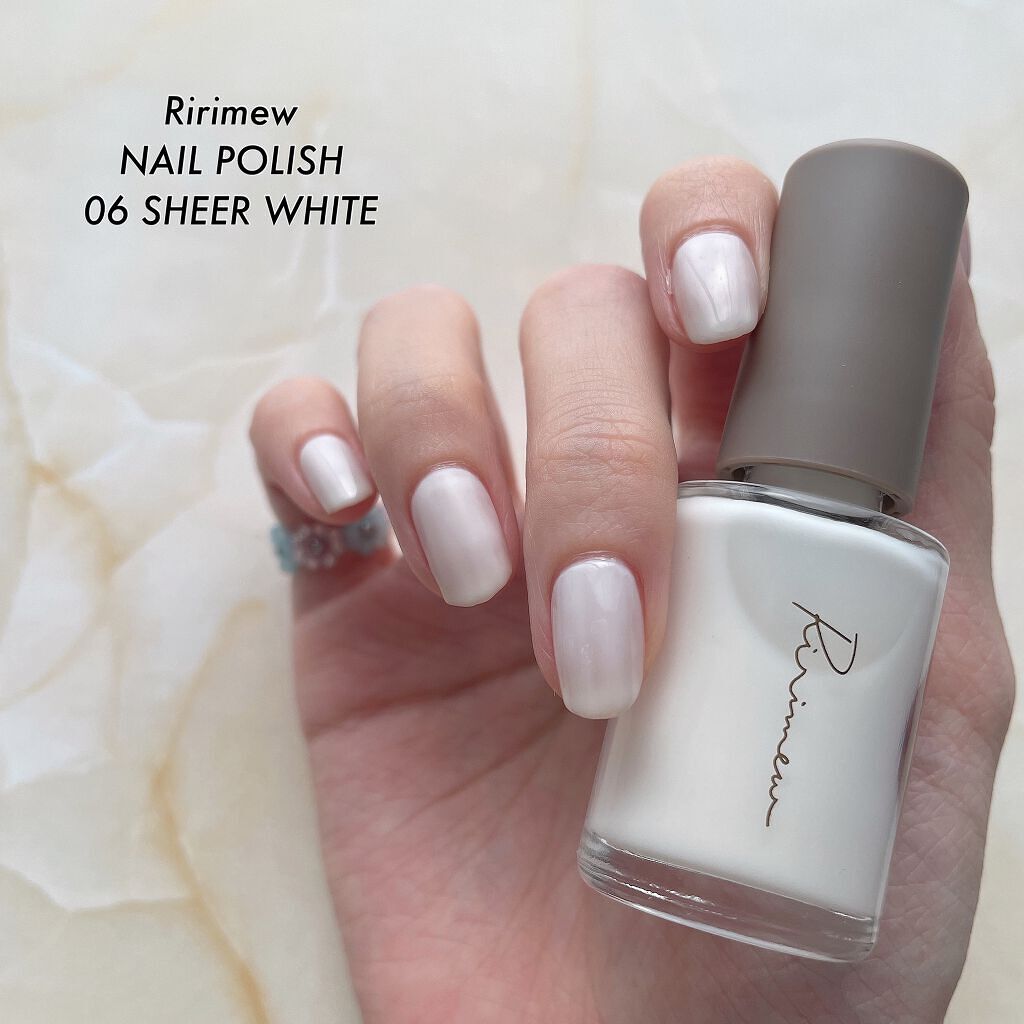 透け感がかなりあるので柔らかいホワイトネイルになります🥰 重ねてつけることで発色も増して、私は三度塗りの透け感と発色がちょうど良くて好み💖 驚いたのが速乾具合!! 今まで使ってきたネイルポリッシュの中で1番乾くの早いって思いました!! サイズ感も小さめでコスパもいいので、他のカラーも買います😍