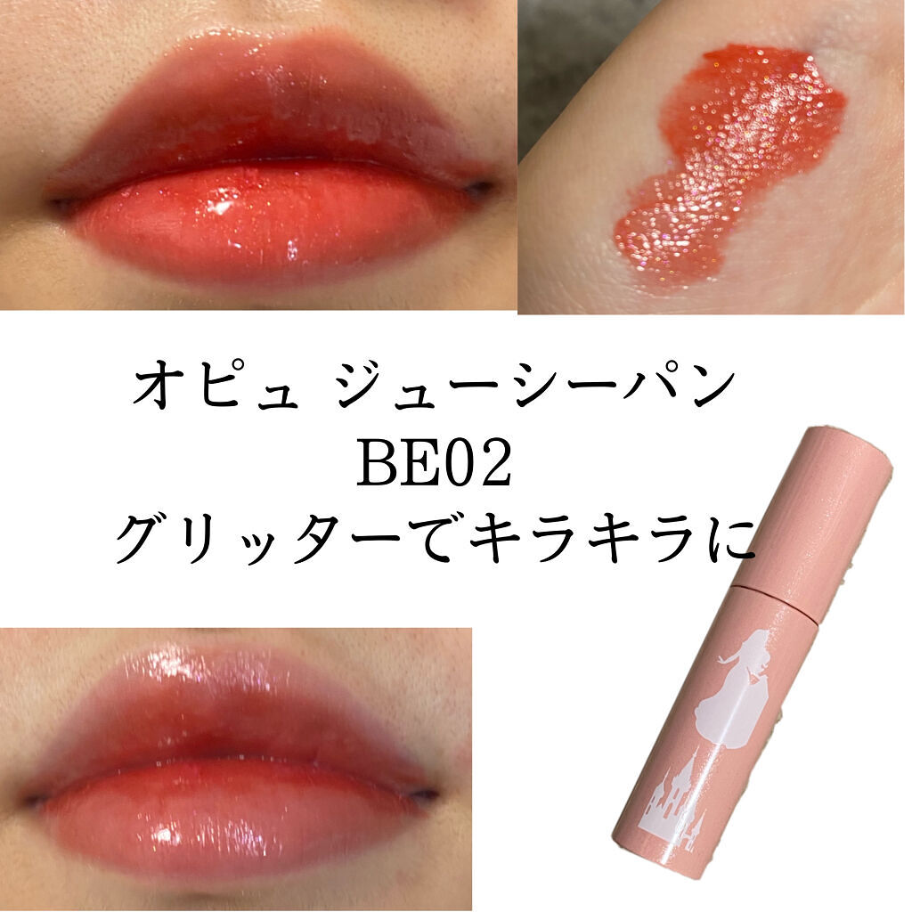 ラメがめちゃくちゃ可愛いA’pieuのジューシーパン スパークリングティント。BE01のときめくイチジクはベースがベージュ系のナチュラルカラーでゴールドやホワイト系のラメが入っています! 普段から濃いめのリップが好きな方は物足りないと感じると思うので、こちらを全体的に塗った上に内側に濃いめのリップ塗ってもとても可愛く仕上がります🫶🏻 ティント効果もあって、ティッシュオフするとツヤ感は失われるものの色とラメはしっかり残ります!
