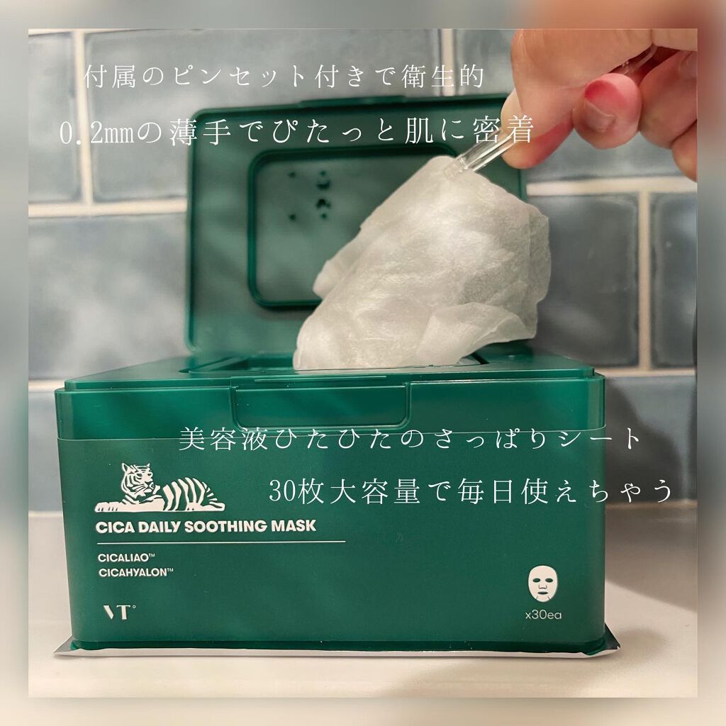 全国のマツモトキヨシ・ココカラファイングループで限定販売! 既存のCICA DAILY SOOTHING MASKの2倍濃縮されたCICA成分配合! つるんとした柔らかいシートが肌にしっかり密着! 毎日でも負担なくゆらぎケアができるので、めんどくさがり屋でも貼るだけで手軽にデイリーケアができる! 花粉や紫外線でゆらぎがちなこの時期にぴったりのCICAマスク✨ 薄めだけどしっかりお顔にフィットしてくれてデイリー使いにぴったり🩷