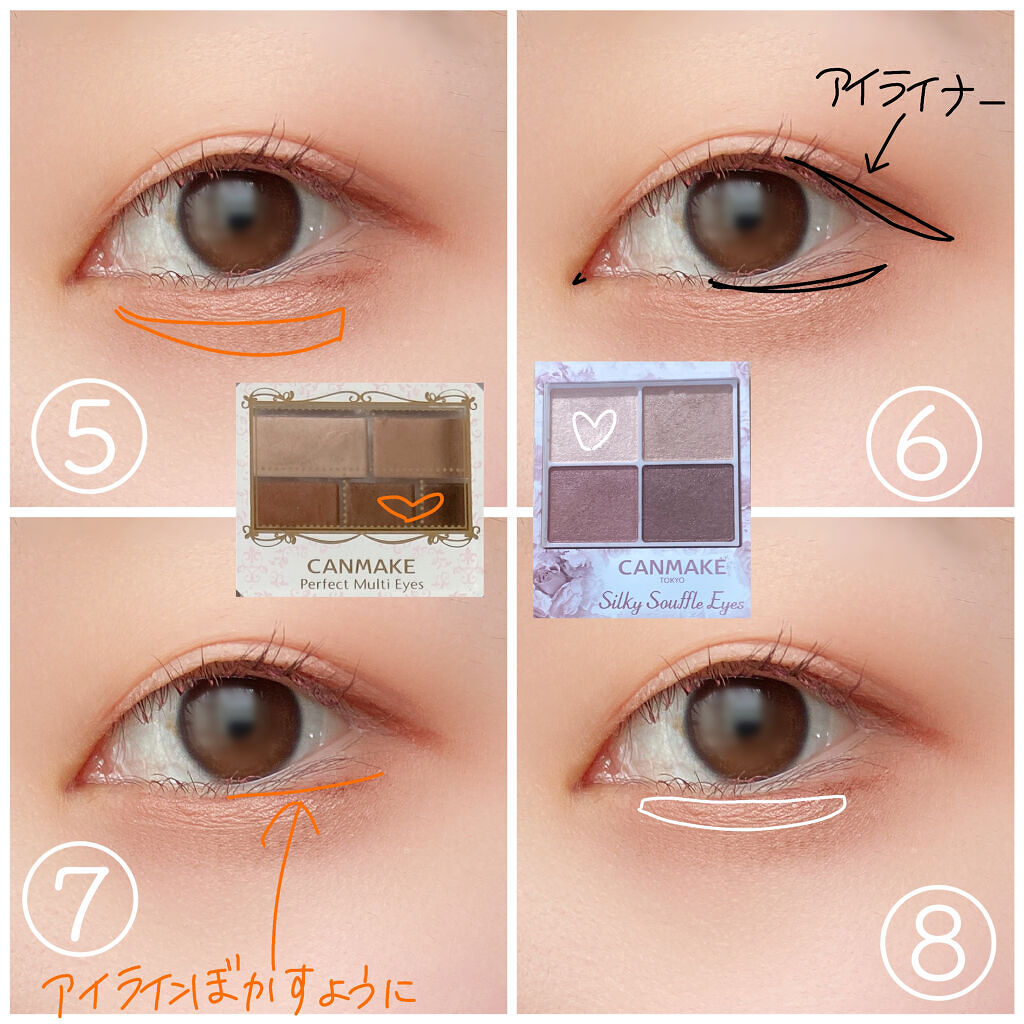 *CANMAKE・CEZANNEでアイメイク記録用*初投稿です𓇬𓂂𓈒《手順》1.パーフェクトマルチアイズのホワイトとベージュを上まぶたに2.ベージュを縦横に大きくなるように特に目尻側に!3.下側の暗い色2色を混ぜて地雷盛りライン薄めに4.暗い...