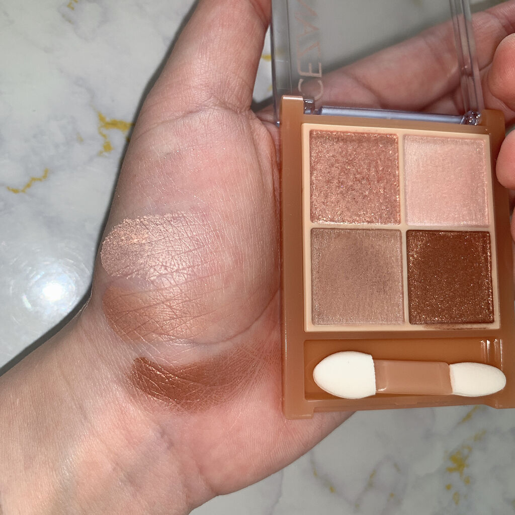 - ラメ・パール・マット3質感の4色アイシャドウ。 肌馴染みの良いベージュを基調としたカラー。ラメ・パール・マットの3質感を重ねて、自然にまぶたを強調し奥行のある大きな目元へ。 しっとり溶け込むような柔らかなパウダーなので、スルスル伸びてまぶたにピタッと密着。保湿成分(スクワラン・ホホバ種子油)配合。