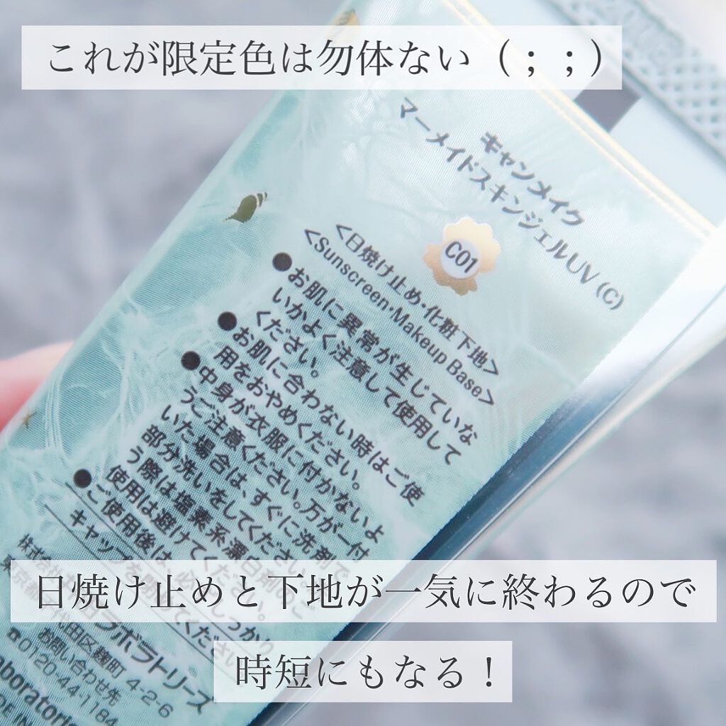 キャンメイクマーメイドスキンジェルUVC03 ピュアパープルLIPS購入品日焼け止めジェルナイアシンアミド配合美容液84%配合SPF50PA++++UVカットも良き良き♪洗顔後orスキンケア後に使用できる所がいいねぇ。。。化粧下地効果があるら...