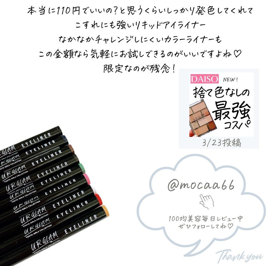 ダイソーの2024秋冬コスメは2年振りの #URGLAM とTGCのコラボ💄 やっぱり筆タイプのリキッドアイライナー好きだー!! 100均のアイライナーって基本フェルトタイプでまぁまぁ描きやすくはあるんだけど、プラス100円出す価値ある👑 カラーマスカラ使ったことない人も200円なら手が出しやすいよね🥰