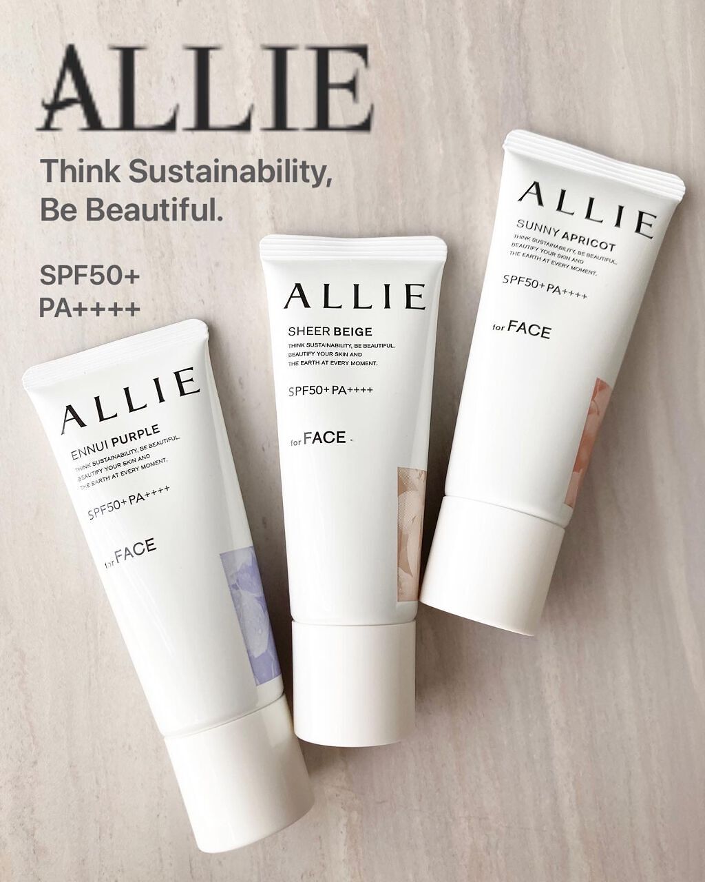 - 世界を想う 美しさつづく*1 日やけ止め おでかけも、マスクを外す機会も増える毎日に。 一部の国・地域・ビーチの規制に配慮した設計のビーチフレンドリー処方。 これ 1 本で、UV カット&顔色補整効果でクマ・くすみ・色ムラまでカバー! テカりにくく、くずれにくいノーファンデ UV*2 【ENNUI PURPLE】 くすみや毛穴をカバー 儚げな透明感のある顔印象続く 澄んだ気分を誘う 紫陽花しずく&セージの香り 【SUNNY APRICOT】 クマや毛穴をカバー いきいきとした血色感のある顔印象つづく 思わず出かけたくなる アプリコット&金木犀の香り 【SHERR BEIGE】 色ムラや毛穴をカバー 均一で抜け感のある顔印象つづく 自然で飾らない シトラスウッディ&パチュリの香り ●一部の国・地域・ビーチの規制に配慮した設計の「ビーチフレンドリー処方」 ●SPF50+・PA++++ ●汗・水 こすれに強く落ちにくい フリクションプルーフ・スーパーウォータープルーフ ●ベタつきにくい感触がつづく ●テカりにくくキレイな肌仕上がりがつづく ●環境に配慮した素材を使用したパッケージ採用 ●美容液成分(保湿)ヒアルロン酸Na配合 ●顔用 ●普段のメイククレンジングで落とせる ●マスク・タオル等につきにくい ●化粧下地効果 *1 スキンケア効果またはメイクアップ効果による肌仕上がりのこと *2 ファンデーション未使用時でも、自然なベースメイクが仕上がる日やけ止めのこと *3 チリ・ほこり・PM2.5・花粉等すべての微粒子汚れの付着を防ぐわけではありません 01:ENNUI PURPLE パープル 02:SUNNY APRICOT アプリコットピンク 03:SHEER BEIGE ミルキーベージュ