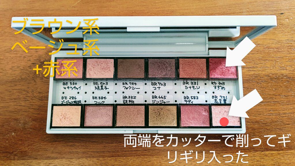 見事にフィットしました*\(^o^)/*カッター1本で作れます‼️簡単🤗❤️【無印良品メイクパレット+マジョリカマジョルカシャドーカスタマイズ】手間がかかるとしたらパレットの突起部分を削らなきゃならない事…でも簡単(👍 ̄▽ ̄)👍突起部分は結構...