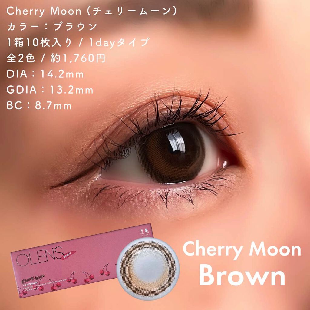 ちゅるんとした目元になれる素敵なデザインがたくさんなOLENSシリーズ! 今回装用したチェリーブラウンは一番の特徴はなんといってもこの三日月デザイン! 可愛らしいデザインながらもナチュラルに馴染んでくれるので簡単にちゅるんとした目元になれる♡