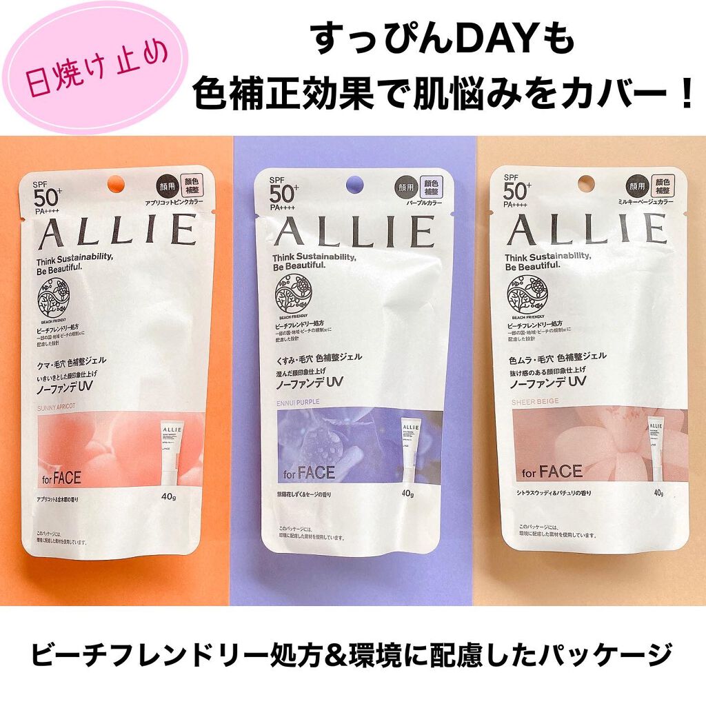 - 世界を想う 美しさつづく*1 日やけ止め おでかけも、マスクを外す機会も増える毎日に。 一部の国・地域・ビーチの規制に配慮した設計のビーチフレンドリー処方。 これ 1 本で、UV カット&顔色補整効果でクマ・くすみ・色ムラまでカバー! テカりにくく、くずれにくいノーファンデ UV*2 【ENNUI PURPLE】 くすみや毛穴をカバー 儚げな透明感のある顔印象続く 澄んだ気分を誘う 紫陽花しずく&セージの香り 【SUNNY APRICOT】 クマや毛穴をカバー いきいきとした血色感のある顔印象つづく 思わず出かけたくなる アプリコット&金木犀の香り 【SHERR BEIGE】 色ムラや毛穴をカバー 均一で抜け感のある顔印象つづく 自然で飾らない シトラスウッディ&パチュリの香り ●一部の国・地域・ビーチの規制に配慮した設計の「ビーチフレンドリー処方」 ●SPF50+・PA++++ ●汗・水 こすれに強く落ちにくい フリクションプルーフ・スーパーウォータープルーフ ●ベタつきにくい感触がつづく ●テカりにくくキレイな肌仕上がりがつづく ●環境に配慮した素材を使用したパッケージ採用 ●美容液成分(保湿)ヒアルロン酸Na配合 ●顔用 ●普段のメイククレンジングで落とせる ●マスク・タオル等につきにくい ●化粧下地効果 *1 スキンケア効果またはメイクアップ効果による肌仕上がりのこと *2 ファンデーション未使用時でも、自然なベースメイクが仕上がる日やけ止めのこと *3 チリ・ほこり・PM2.5・花粉等すべての微粒子汚れの付着を防ぐわけではありません 01:ENNUI PURPLE パープル 02:SUNNY APRICOT アプリコットピンク 03:SHEER BEIGE ミルキーベージュ