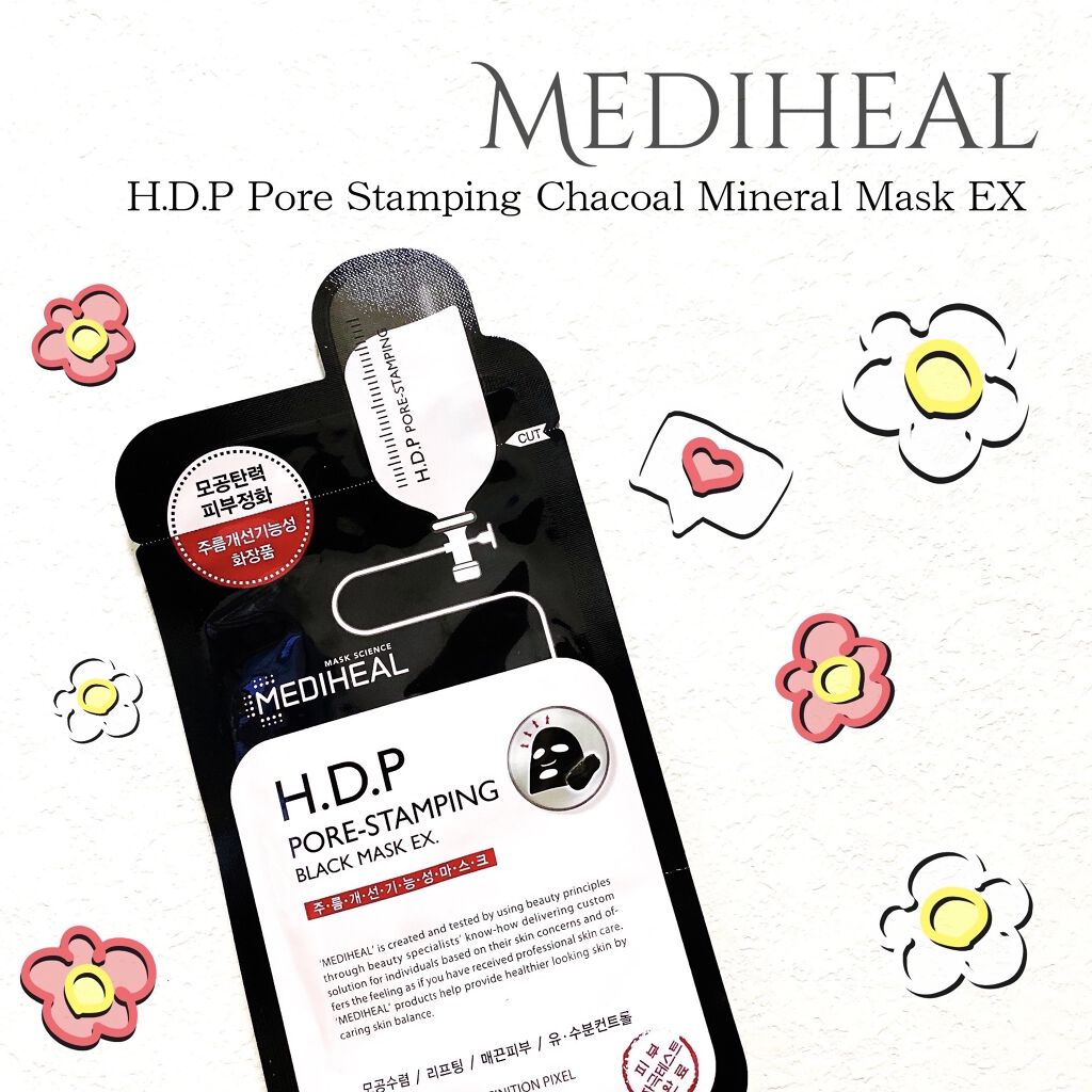 MEDIHEALH.D.PポアスタンピングブラックマスクEX.チャコールシート『炭』が気になる毛穴、油っぽさ、にきびが気になるお肌をケア🧖♀️シルクのような感触のセルロースシート使用し、配合のホーステールマッシュルーム抽出物とピクセル溶液(...