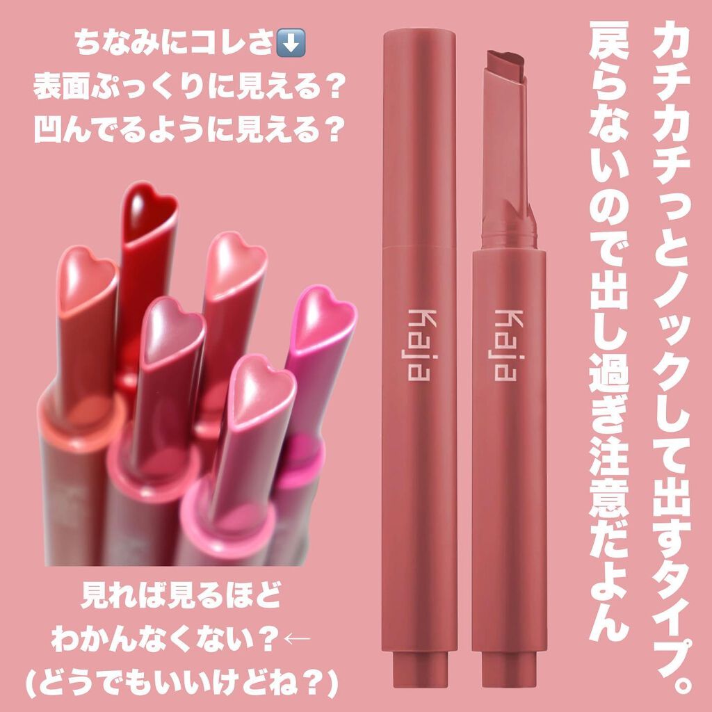 - 底部をノックするとハート型で出てくるリップスティック。オイル成分を※2配合し、唇の温度でとろけて、ツヤのある仕上がりに。トレンド感ある豊富なカラーをラインアップしました。*繰り戻しできないタイプ ※2:アルガニアスピノサ核油、プルーン種子油(整肌成分)