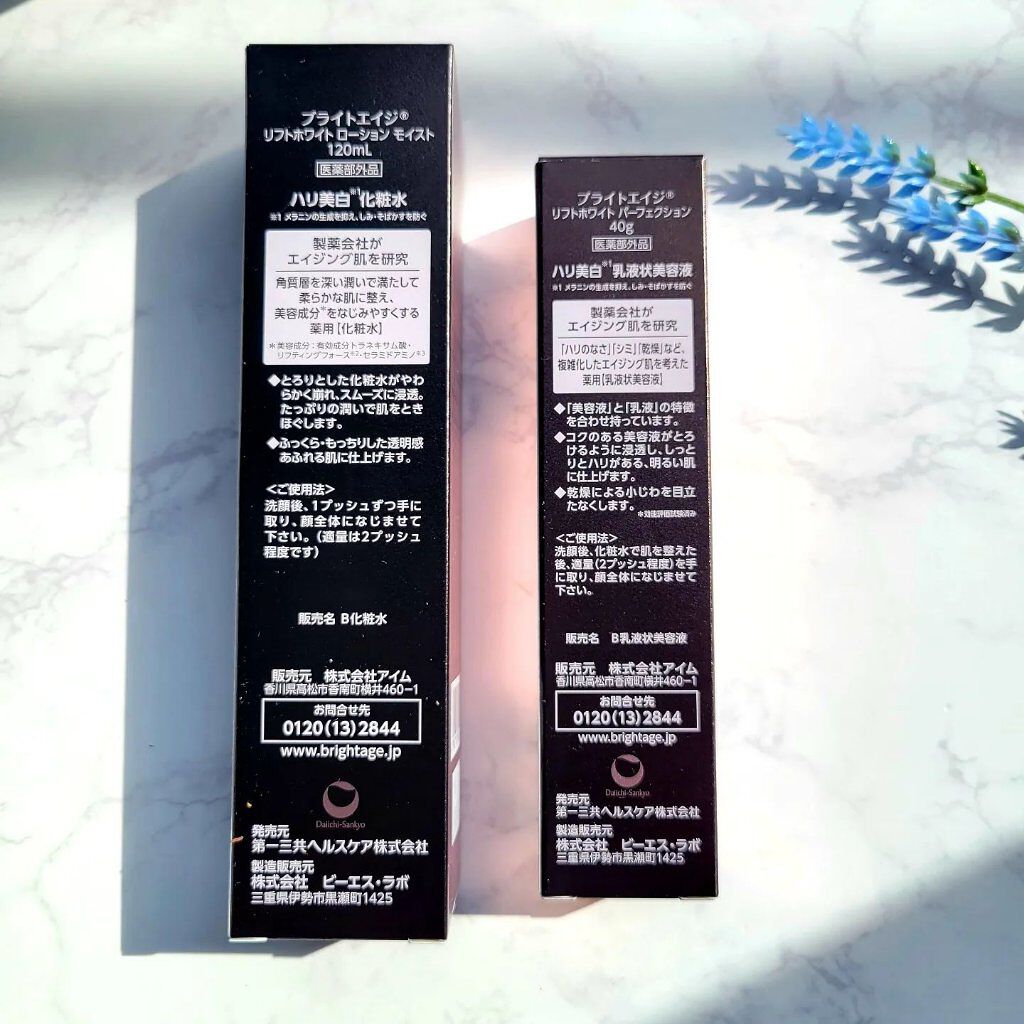 BRIGHTAGEリフトホワイトローションモイスト&リフトホワイトパーフェクションを使ってみています✨️第一三共ヘルスケア開発のエイジングケア*¹「ブライトエイジ」。このスキンケアラインの良いところは、たった2つで完了できる手軽さ💕忙しい日や...