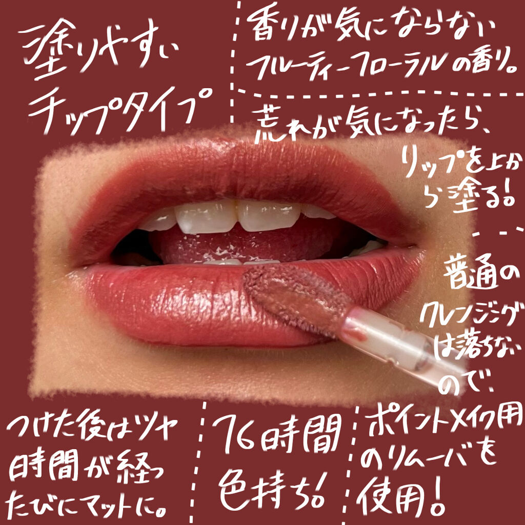甘さひかえめショコラローズのこのお色💄 くすみ系のローズベージュな感じで絶妙なカラーです マットとツヤの間の絶妙なツヤ感が最高にいいです 16時間落ちにくいというからびっくり 実際に塗ったところ本当に色落ちしなくてすごい