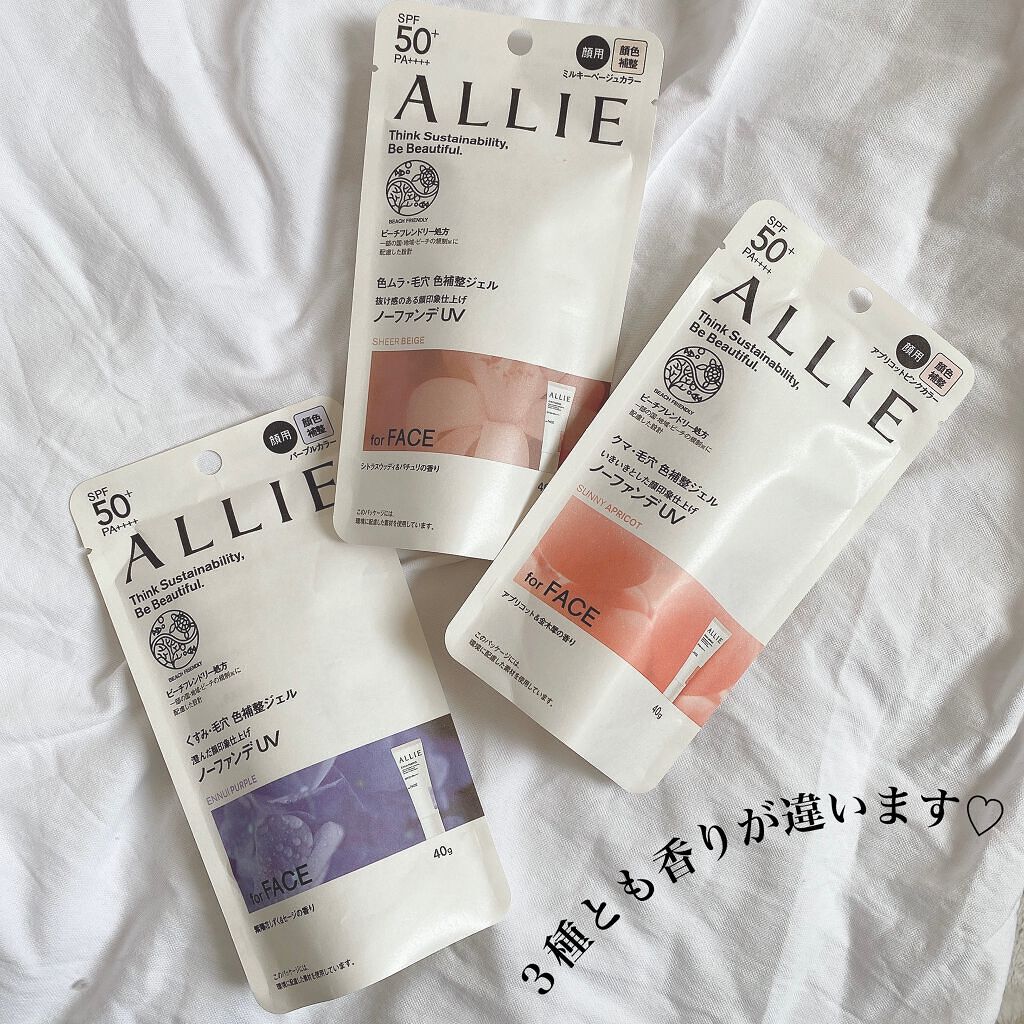 - 世界を想う 美しさつづく*1 日やけ止め おでかけも、マスクを外す機会も増える毎日に。 一部の国・地域・ビーチの規制に配慮した設計のビーチフレンドリー処方。 これ 1 本で、UV カット&顔色補整効果でクマ・くすみ・色ムラまでカバー! テカりにくく、くずれにくいノーファンデ UV*2 【ENNUI PURPLE】 くすみや毛穴をカバー 儚げな透明感のある顔印象続く 澄んだ気分を誘う 紫陽花しずく&セージの香り 【SUNNY APRICOT】 クマや毛穴をカバー いきいきとした血色感のある顔印象つづく 思わず出かけたくなる アプリコット&金木犀の香り 【SHERR BEIGE】 色ムラや毛穴をカバー 均一で抜け感のある顔印象つづく 自然で飾らない シトラスウッディ&パチュリの香り ●一部の国・地域・ビーチの規制に配慮した設計の「ビーチフレンドリー処方」 ●SPF50+・PA++++ ●汗・水 こすれに強く落ちにくい フリクションプルーフ・スーパーウォータープルーフ ●ベタつきにくい感触がつづく ●テカりにくくキレイな肌仕上がりがつづく ●環境に配慮した素材を使用したパッケージ採用 ●美容液成分(保湿)ヒアルロン酸Na配合 ●顔用 ●普段のメイククレンジングで落とせる ●マスク・タオル等につきにくい ●化粧下地効果 *1 スキンケア効果またはメイクアップ効果による肌仕上がりのこと *2 ファンデーション未使用時でも、自然なベースメイクが仕上がる日やけ止めのこと *3 チリ・ほこり・PM2.5・花粉等すべての微粒子汚れの付着を防ぐわけではありません 01:ENNUI PURPLE パープル 02:SUNNY APRICOT アプリコットピンク 03:SHEER BEIGE ミルキーベージュ