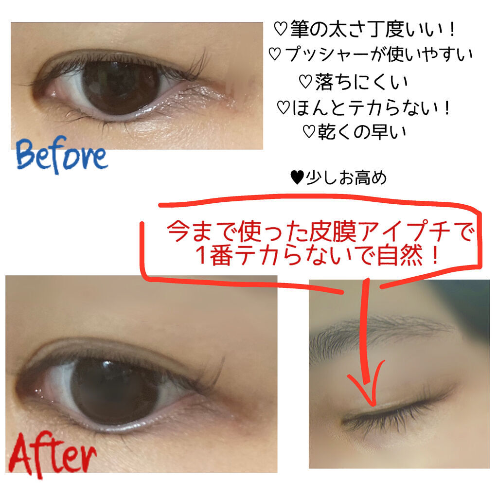 - 【感動の自然さ】 ・膜を作ってまぶたに折り込むタイプ ・ふたえの幅を広げたい方、ひとえの方へ ・今までの皮膜では叶わなかった方に ・薄付きなのにしっかり硬い膜でまぶたを支える ・テカらず肌になじむ ・天然ゴムラテックスフリーの新処方(シン・ラテックス) ・目元のハリケアにも*メイクアップ効果による ・クセ付け・保湿成分配合
