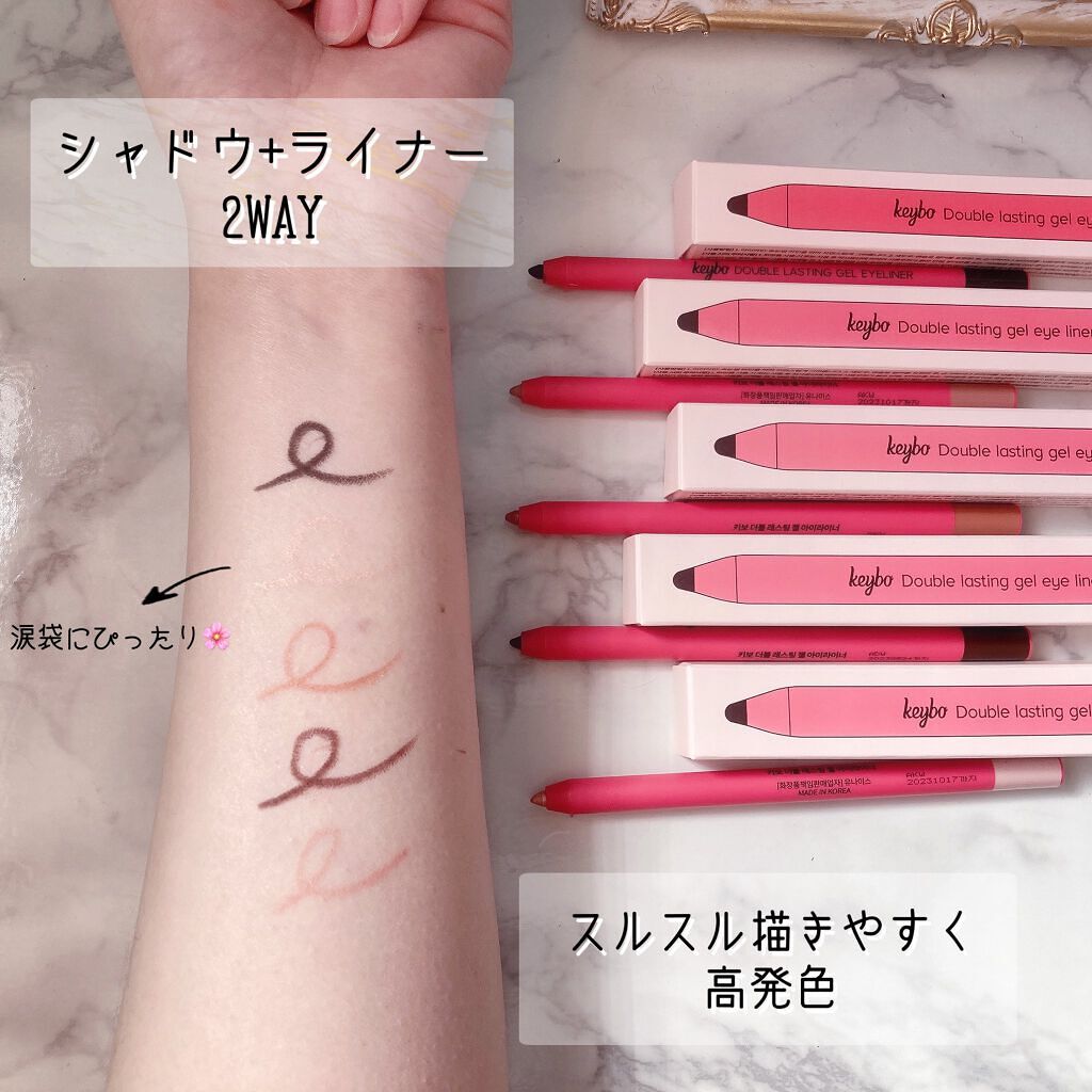 Keybo(キボ)ダブルラスティングジェルアイライナー06スターライト綿菓子アイライナーとしてもアイシャドウとしても使えるなめらかな描きごこちのジェルアイライナー。06スターライト綿菓子はパールが繊細にきらめく薄ピンク色。アイホールにのばした...