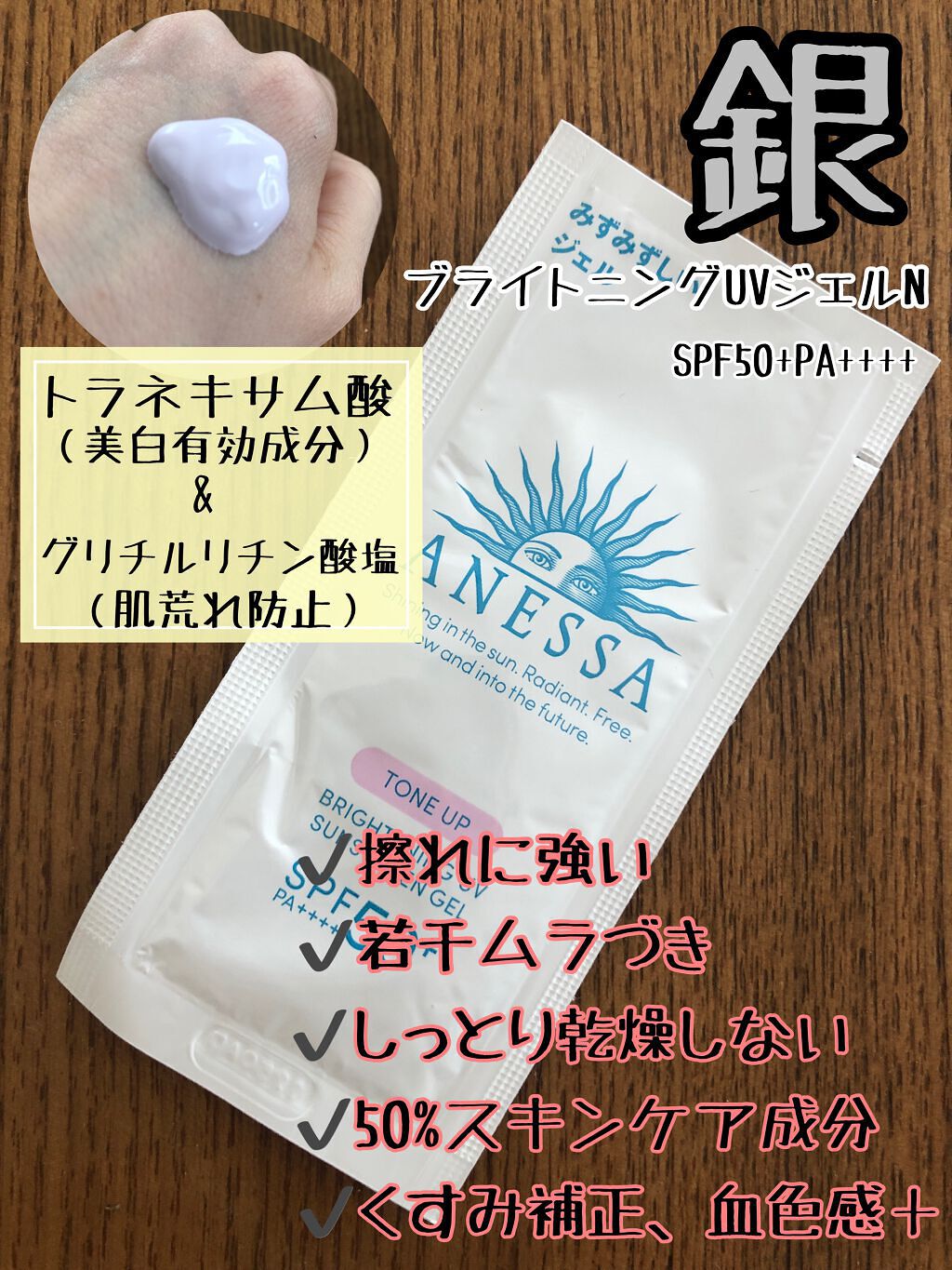 アネッサブライトニングUVジェルN今年もリピしました〜!主に使うのは首!メイクすると顔と首の色の差が目立ちがちなので首にこれを塗るとちょうどいい!安心のアネッサ!日焼け止め効果もしっかりあるから夏場に使うのもぴったり!ラベンダーカラーだけど、...