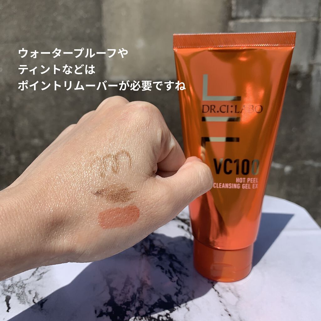 - リニューアル発売 処方アップグレード 史上最高※1、美容成分93. 7%※2配合の温感ゲルでメイクや毛穴奥の汚れ、黒ずみをしっかりオフ W洗顔不要の高機能クレンジング ビタミンC(APPS*1)配合。美容成分93.7%※2の毛穴対策温感クレンジング『VC100ホットピールクレンジングゲルEX』が、 クレンジング力と美容成分をパワーアップし、しっかり温感効果がうれしい美容液級のクレンジングへと進化をとげて新登場。 クレンジング・洗顔・ピーリング・温感マッサージ・温感パックの5つの機能を備えたW洗顔不要の高機能クレンジング洗顔です。 クレイ*2、2種のタンパク質分解酵素*3、植物由来のピーリング成分*4を含む温感ゲルが、肌にとろけるようになじみ、毛穴の奥に入り込んだメイク汚れや皮脂、不要な角質をしっかり吸着。ポイントメイクまでするんと落とす抜群のクレンジング力で、ツルッとなめらかで明るい洗いあがりを実現します。また、注目の高機能成分「ナイアシンアミド*5」や保湿成分*6など、史上最高※193.7%※2 配合の美容成分が、洗うたびにくすみ※4や初期エイジングのサイン※5を一掃、使うたびに肌表面がうるおいやハリで満たされる素肌に。 日中の肌を環境ストレス※6から守る「アルテロモナス発酵エキス*5」も新配合しました。 柑橘系のさわやかな香り。 無香料(植物由来の精油を使用)、無合成着色料、無鉱物油、パラベンフリー、アルコール無添加、石油系界面活性剤フリー。 ※1 ドクターシーラボにおいて ※2 当社調べ ※3 角層まで ※4 古い角質によりくすんで見えること ※5 年齢を重ねた肌 ※6 乾燥、紫外線 *1 パルミチン酸アスコルビルリン酸3Na(製品の抗酸化剤として) *2 モロッコ溶岩クレイ(洗浄成分) *3 プロテアーゼ、パパイン(洗浄成分)*4 ライム果汁、レモン果汁、グレープフルーツ果実エキス、オレンジ果汁、サンザシエキス、 ナツメ果実エキス、リンゴ果実エキス、乳酸桿菌/セイヨウナシ果汁発酵液(洗浄成分) *5 整肌成分