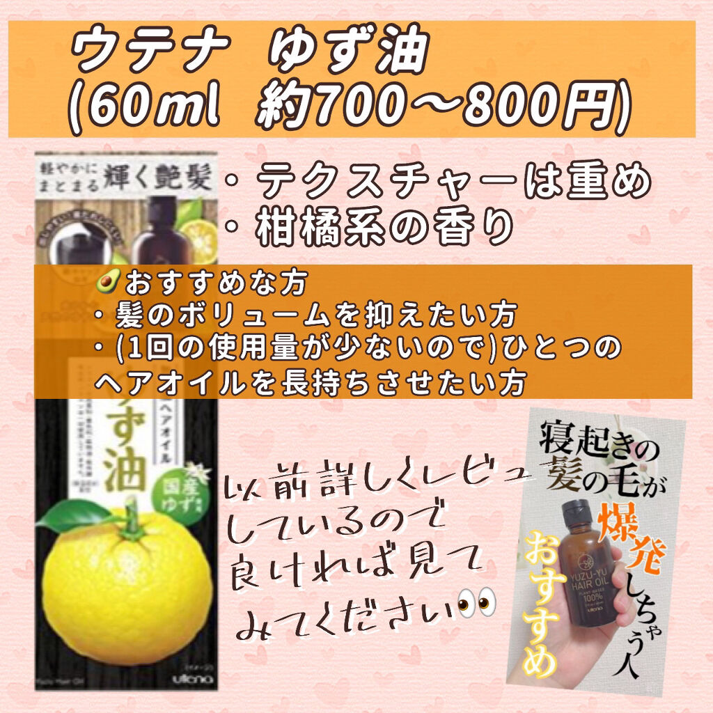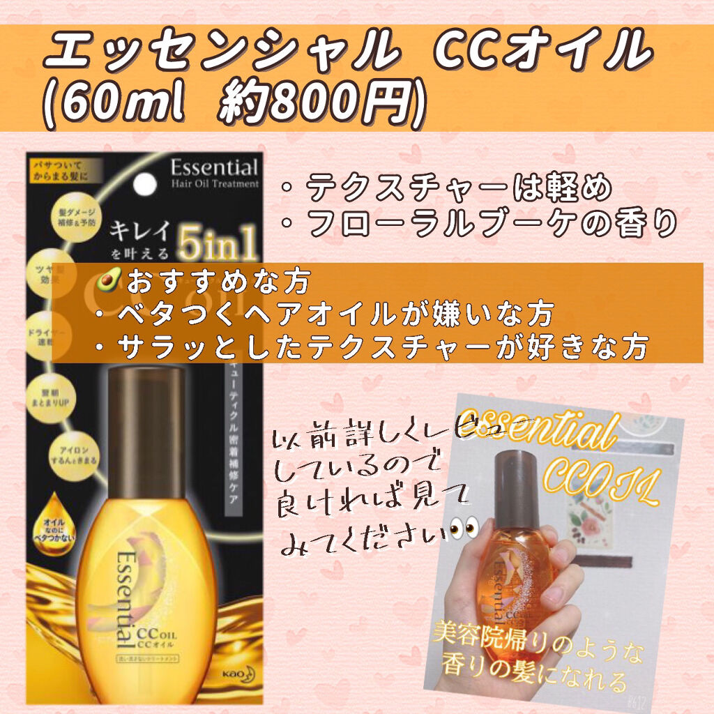 私はどのヘアオイルも指通りのいい髪になれました! 髪質によって軽めのオイルが良かったり、重めのオイルが良かったりすると思うので、今回はその点を中心にまとめてみました🙌🏻 エッセンシャル CCオイル(60ml 約800円) ・テクスチャーは軽め ・フローラルブーケの香り エリップス ヘアオイル(6粒 約300円) ・結構重めのテクスチャー ・私的には匂いにクセがあった ルシードエル EXヘアオイル(60ml 約1000円) ・テクスチャーは軽め ・フローラル系の香り ウテナ ゆず油 (60ml 約700~800円) ・テクスチャーは重め ・柑橘系の香り LUX スーパーリッチシャインダメージリペア リッチ補修オイル (85ml 約1000円) ・テクスチャーは最初はしっとり、馴染むとサラサラ ・フローラル系の香り &honey ディープモイスト ヘアオイル3.0 (100ml 1540円) ・少し重めなテクスチャー ・蜂蜜の香り