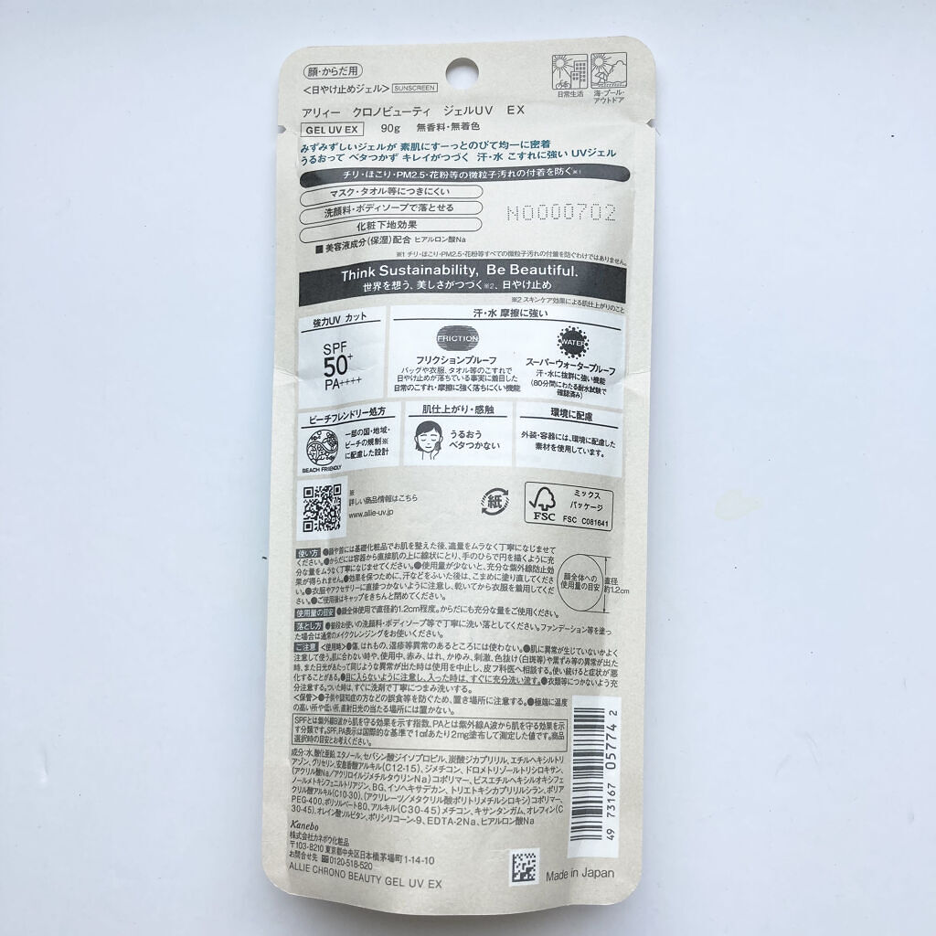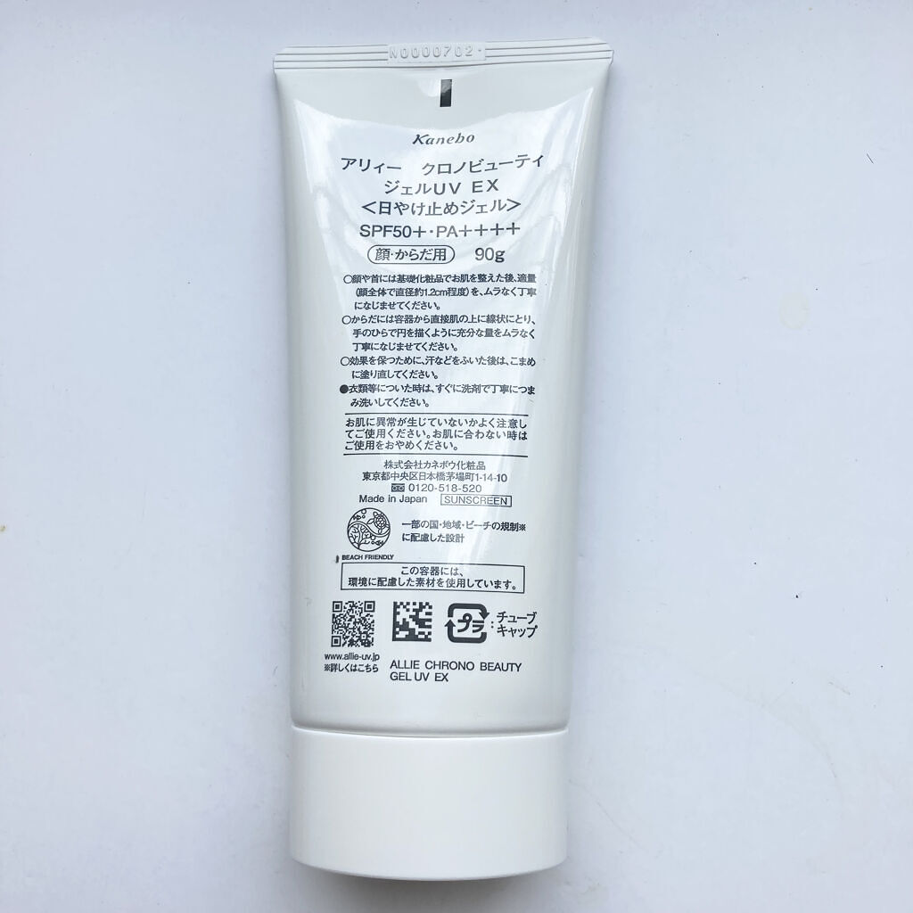 - 世界を想う 美しさつづく*1 日やけ止め おでかけには、落ちにくく、気持ちいい感触がつづく日やけ止めを。 一部の国・地域・ビーチの規制に配慮した設計のビーチフレンドリー処方。 汗・水・こすれにも強く、ベタつかずうるおう仕上がりが持続するジェル UV ●一部の国・地域・ビーチの規制に配慮した設計の「ビーチフレンドリー処方」 ●SPF50+・PA++++ ●汗・水 こすれに強く落ちにくい フリクションプルーフ・スーパーウォータープルーフ ●ベタつきにくい感触がつづく ●うるおい感のある肌仕上がりがつづく ●環境に配慮した素材を使用したパッケージ採用 ●美容液成分(保湿)ヒアルロン酸Na配合 ●顔・からだ用 ●洗顔料・ボディーソープで落とせる ●マスク・タオル等につきにくい ●化粧下地効果 ●無香料・無着色 ●チリ・ほこり・PM2.5・花粉等の微粒子汚れの付着を防ぐ*2 *1 スキンケア効果またはメイクアップ効果による肌仕上がりのこと *2 チリ・ほこり・PM2.5・花粉等すべての微粒子汚れの付着を防ぐわけではありません <限定セットA:セット内容> ・アリィー クロノビューティ ジェルUV EX 90g ・アリィー クロノビューティ ラスティングプライマーUV 5g ※セット商品の成分につきましては各商品ページでご確認ください。