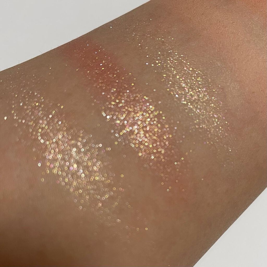 mude.の方がよりあたたかみのある印象で全体的に使いやすい色味が入っている感じ◎ ラメ感もギラギラするよりかは上品なキラキラ感✨ rom&ndはmude.に比べるとフレッシュな印象!春や夏に使うと映えそう❣️ ラメ感も強く、目立つかな。 似てるかもしれないからと買うのを長い間悩んでいましたが、仕上がりが全然変わってくるので、買って良かった😂❤️ 粉質はブランドも違うので違ったよ✨ rom&ndの方がしっとり感があって強く発色する感じ。 mude.は淡い発色で、初心者さんも使いやすいと思った🫶🏻