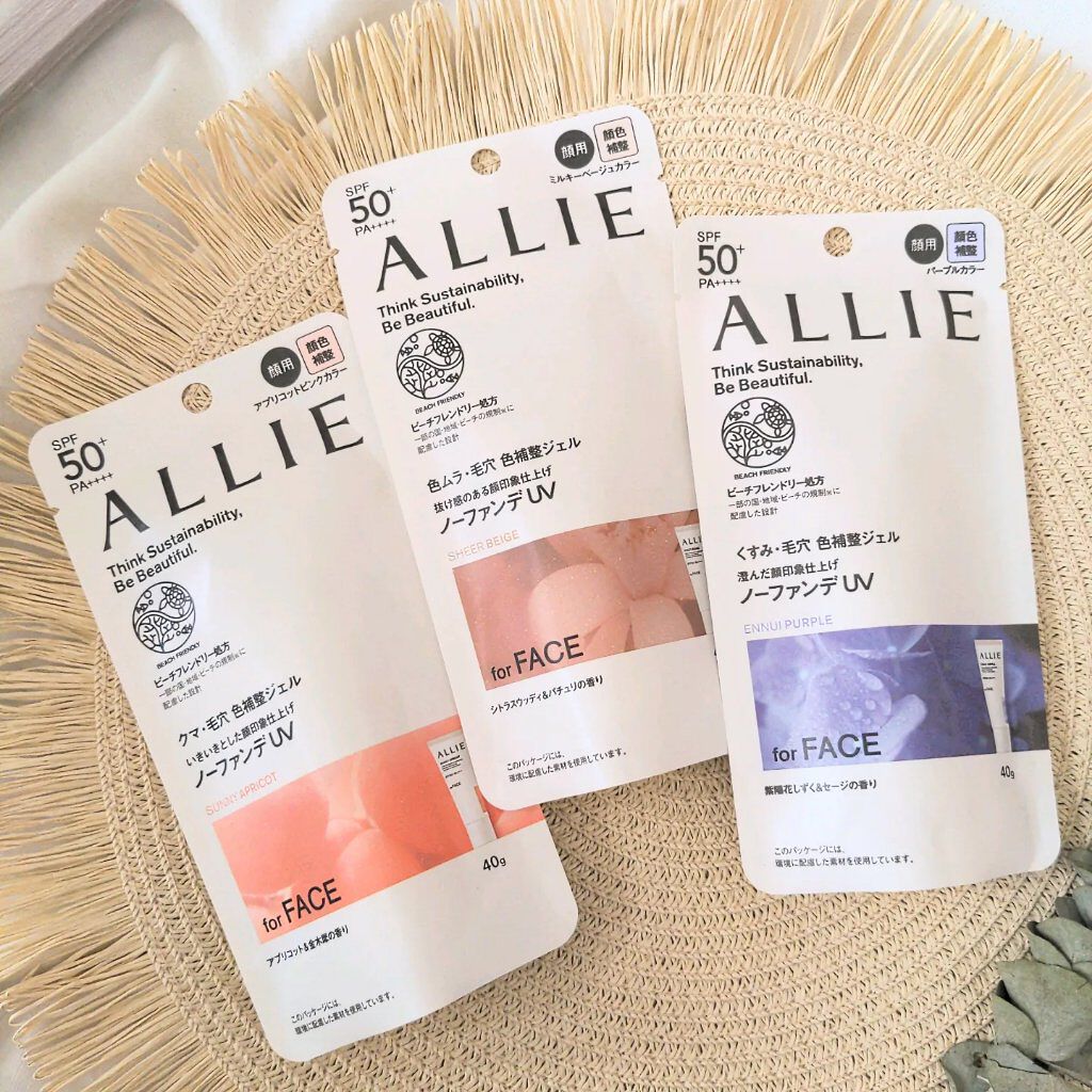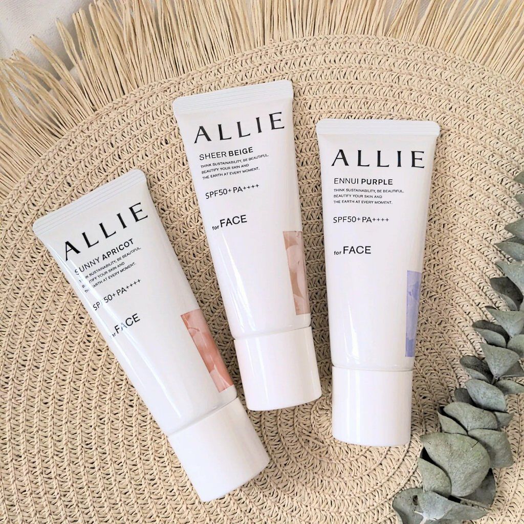 - 世界を想う 美しさつづく*1 日やけ止め おでかけも、マスクを外す機会も増える毎日に。 一部の国・地域・ビーチの規制に配慮した設計のビーチフレンドリー処方。 これ 1 本で、UV カット&顔色補整効果でクマ・くすみ・色ムラまでカバー! テカりにくく、くずれにくいノーファンデ UV*2 【ENNUI PURPLE】 くすみや毛穴をカバー 儚げな透明感のある顔印象続く 澄んだ気分を誘う 紫陽花しずく&セージの香り 【SUNNY APRICOT】 クマや毛穴をカバー いきいきとした血色感のある顔印象つづく 思わず出かけたくなる アプリコット&金木犀の香り 【SHERR BEIGE】 色ムラや毛穴をカバー 均一で抜け感のある顔印象つづく 自然で飾らない シトラスウッディ&パチュリの香り ●一部の国・地域・ビーチの規制に配慮した設計の「ビーチフレンドリー処方」 ●SPF50+・PA++++ ●汗・水 こすれに強く落ちにくい フリクションプルーフ・スーパーウォータープルーフ ●ベタつきにくい感触がつづく ●テカりにくくキレイな肌仕上がりがつづく ●環境に配慮した素材を使用したパッケージ採用 ●美容液成分(保湿)ヒアルロン酸Na配合 ●顔用 ●普段のメイククレンジングで落とせる ●マスク・タオル等につきにくい ●化粧下地効果 *1 スキンケア効果またはメイクアップ効果による肌仕上がりのこと *2 ファンデーション未使用時でも、自然なベースメイクが仕上がる日やけ止めのこと *3 チリ・ほこり・PM2.5・花粉等すべての微粒子汚れの付着を防ぐわけではありません 01:ENNUI PURPLE パープル 02:SUNNY APRICOT アプリコットピンク 03:SHEER BEIGE ミルキーベージュ