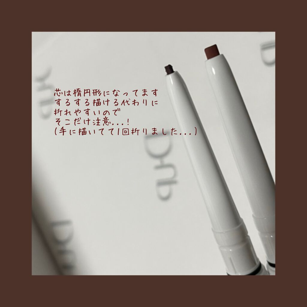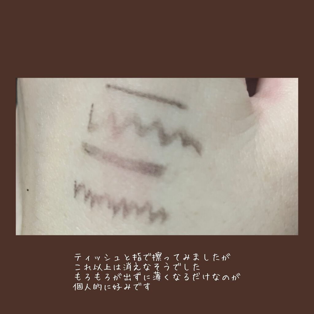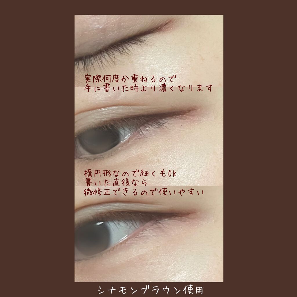 するする滑らかに描けてにじみにくくて◎ もう少し細く描けたら更に良いですね👍✨ シナモンブラウンは、優しい雰囲気になれて万人受けしそうな人を選ばないカラーだと思いました♪ カラーで迷う人は、このシナモンブラウンがオススメです🙌💕