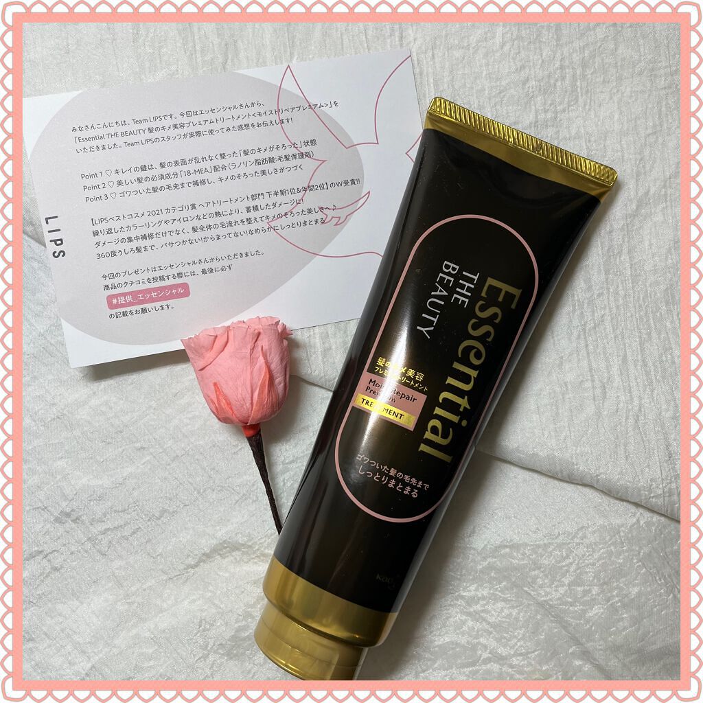 - ※2025/3/24、パッケージ順次リニューアル。 繰り返したカラーリングやアイロンの熱により、蓄積したダメージに。 エッセンシャル ザ ビューティ 髪のキメ美容プレミアムトリートメント ゴワついた髪の毛先までなめらかにしっとりまとまる。 「蓄積ダメージ補修」で髪の内部ダメージ&キューティクルダメージを集中補修。 「ゴワつき乱れ補整」でゴワつく髪も根元から毛先までなめらかに整えて、キレイな毛流れに。 熱をかけたとき形付けやすい。 ●美しい髪の必須成分「18-MEA」配合(ラノリン脂肪酸:毛髪保護剤) ●透明感あふれるフローラルリュクスの香り
