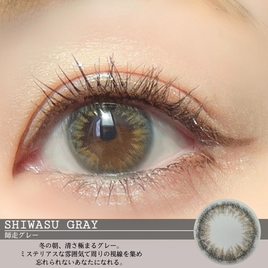 個性的なカラーからナチュラルなものまで幅広いラインナップで見てて楽しかったです! 透明感のあるブルーグレーが瞳に溶け込み、リアルなグレーアイに見せるレンズ。 透け感のある色味だけどしっかり発色するナチュラルハーフ系カラコン。着色直径も小さめなので着せ替え感があってかわいい。 N's COLLECTIONはレンズのつけ心地もすごく良くて他のカラーもとっても可愛いです!