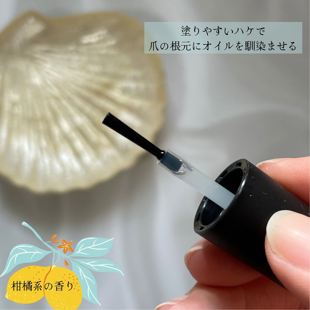 - さらっとなじんでうるおうのに ベタつかない。 乾燥しがちな爪や指先を ケアするキューティクルオイル。 ・ ひと塗りで、爪や甘皮にうるおいを補給。しっとり美しい指先を叶えるキューティクルオイル。 ・ 軽やかにのびて肌なじみが良く、爪先をしっかりケアします。 ・ さらさらとのび広がり、ベタつくことなくご使用いただけます。 ・ ツヤとうるおいにあふれた爪へ仕上げます。 ・ ネイルも美しく映える、すこやかな爪にみちびきます。 ・ ささくれを防いで、美しい指先にみちびきます。 ・ 甘皮をととのえる際にもご使用いただけます。 ・ 気持ちをリラックスさせる柑橘系の香りです。 ・ 無香料