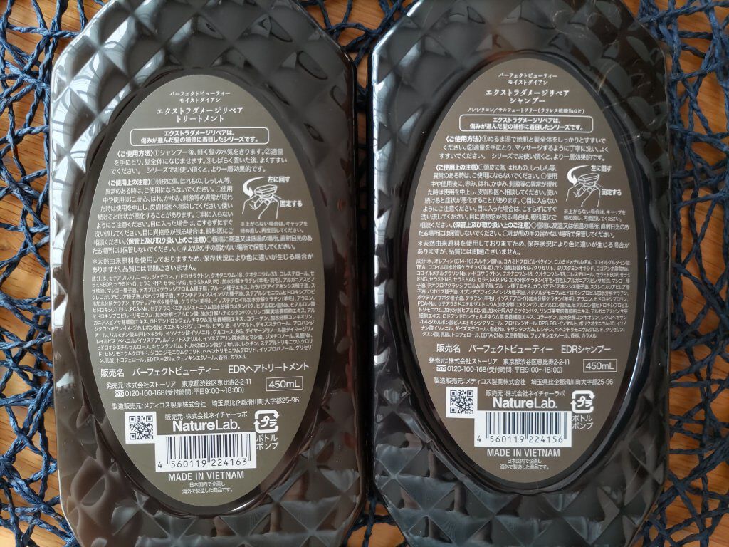 - <シャンプー450ml > 水、オレフィン(C14-16)スルホン酸Na、コカミドプロピルベタイン、コカミドメチルMEA、ココイルグルタミン酸TEA、ココイル加水分解ケラチンK(羊毛)、ヤシ油脂肪酸PEG-7グリセリル、ミリスタミンオキシド、ココアンホ酢酸Na、ココイルメチルタウリンNa、γ-ドコサラクトン、クオタニウム-18、クオタニウム- 33、コレステロール、セラミドEOP、セラミドNG、セラミドNP、セラミドAG、セラミドAP、PG、加水分解ケラチン(羊毛・羽毛)、アルガニアスピノサ核油、マンゴー種子油、テオブロマグランジフロルム種子脂、プルーン種子エキス、カラパグアイアネンシス種子油、スクレロカリアビレア種子油、バオバブ種子油、オプンチアフィクスインジカ種子油、ステアルジモニウムヒドロキシプロピル加水分解ケラチン、ポウテリアサポタ種子油、ケラチン(羊毛)、イソステアロイル加水分解ケラチン(羊毛)、アラニン、ヒドロキシプロリン、PCA-Na、セテアラミドエチルジエトニウム加水分解コメタンパク、ヒアルロン酸Na、ヒアルロン酸ヒドロキシプロピルトリモニウム、加水分解ヒアルロン酸、加水分解ハチミツタンパク、リンゴ果実培養細胞エキス、アルガニアスピノサ芽細胞エキス、ロドデンドロンフェルギネウム葉培養細胞エキス、コラーゲン、加水分解コンキオリン、シクロヘキサン-1, 4-ジカルボン酸ビスエトキシジグリコール、プロパンジオール、DPG、BG、イソマルト、ポリクオタニウム-10、イソノナン酸イソノニル、ダイズステロール、塩化Na、キサンタンガム、レシチン、ベヘントリモニウムクロリド、グリセリン、クエン酸、乳酸、トコフェロール、EDTA-2Na、安息香酸Na、フェノキシエタノール、香料、カラメル <シャンプー詰め替え用330ml> 水、オレフィン(C14-16)スルホン酸Na、コカミドプロピルベタイン、コカミドメチルMEA、ココイルグルタミン酸TEA、ココイル加水分解ケラチンK(羊毛)、ヤシ油脂肪酸PEG-7グリセリル、ミリスタミンオキシド、ココアンホ酢酸Na、ココイルメチルタウリンNa、γ-ドコサラクトン、クオタニウム-18、クオタニウム- 33、コレステロール、セラミドEOP、セラミドNG、セラミドNP、セラミドAG、セラミドAP、PG、加水分解ケラチン(羊毛・羽毛)、アルガニアスピノサ核油、マンゴー種子油、テオブロマグランジフロルム種子脂、プルーン種子エキス、カラパグアイアネンシス種子油、スクレロカリアビレア種子油、バオバブ種子油、オプンチアフィクスインジカ種子油、ステアルジモニウムヒドロキシプロピル加水分解ケラチン、ポウテリアサポタ種子油、ケラチン(羊毛)、イソステアロイル加水分解ケラチン(羊毛)、アラニン、ヒドロキシプロリン、PCA-Na、セテアラミドエチルジエトニウム加水分解コメタンパク、ヒアルロン酸Na、ヒアルロン酸ヒドロキシプロピルトリモニウム、加水分解ヒアルロン酸、加水分解ハチミツタンパク、リンゴ果実培養細胞エキス、アルガニアスピノサ芽細胞エキス、ロドデンドロンフェルギネウム葉培養細胞エキス、コラーゲン、加水分解コンキオリン、シクロヘキサン-1, 4-ジカルボン酸ビスエトキシジグリコール、プロパンジオール、DPG、BG、イソマルト、ポリクオタニウム-10、イソノナン酸イソノニル、ダイズステロール、塩化Na、キサンタンガム、レシチン、ベヘントリモニウムクロリド、グリセリン、クエン酸、乳酸、トコフェロール、EDTA-2Na、安息香酸Na、フェノキシエタノール、香料、カラメル <トリートメント450ml> 水、セテアリルアルコール、ジメチコン、γ-ドコサラクトン、クオタニウム-18、クオタニウム-33、コレステロール、セラミドEOP、セラミドNG、セラミドNP、セラミドAG、セラミドAP、PG、加水分解ケラチン(羊毛・羽毛)、アルガニアスピノサ核油、マンゴー種子油、テオブロマグランジフロルム種子脂、プルーン種子エキス、カラパグアイアネンシス種子油、スクレロカリアビレア種子油、バオバブ種子油、オプンチアフィクスインジカ種子油、ステアルジモニウムヒドロキシプロピル加水分解ケラチン、ポウテリアサポタ種子油、ケラチン(羊毛)、イソステアロイル加水分解ケラチン(羊毛)、アラニン、ヒドロキシプロリン、PCA-Na、セテアラミドエチルジエトニウム加水分解コメタンパク、ヒアルロン酸Na、ヒアルロン酸ヒドロキシプロピルトリモニウム、加水分解ヒアルロン酸、加水分解ハチミツタンパク、リンゴ果実培養細胞エキス、アルガニアスピノサ芽細胞エキス、ロドデンドロンフェルギネウム葉培養細胞エキス、コラーゲン、加水分解コンキオリン、シクロヘキサン-1,4-ジカルボン酸ビスエトキシジグリコール、ヒマシ油、イソマルト、ダイズステロール、プロパンジオール、パルミチン酸エチルヘキシル、イソノナン酸イソノニル、グルコース、BG、ダイマージリノール酸ダイマージリノレイルビス(ベヘニル/イソステアリル/フィトステリル)、イソステアリン酸水添ヒマシ油、ジメチコノール、乳酸Na、ヒドロキシエチルセルロース