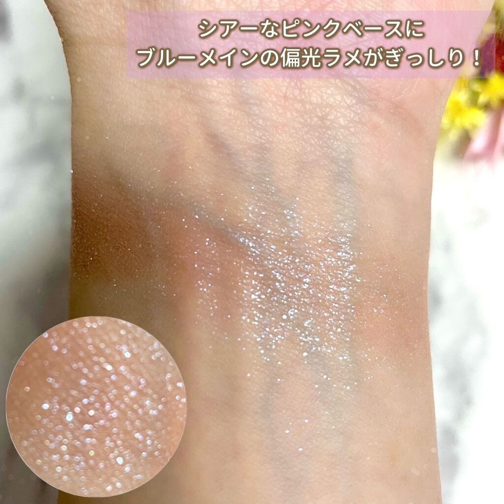 - 思いのままにカスタムできる 大粒ラメがきらめくアイシャドウ ○輝度の高い大粒ラメが密着しラメ落ちしないから、瞳全体輝きを増してより華やかな印象が続く -フローティングベース処方 ○ラメがチラチラ浮いているように輝き、華やかに、そして立体感のある目もとへ。 【色調】 〈フローティング:大粒ラメがチラチラ浮いているように見える仕上がり〉