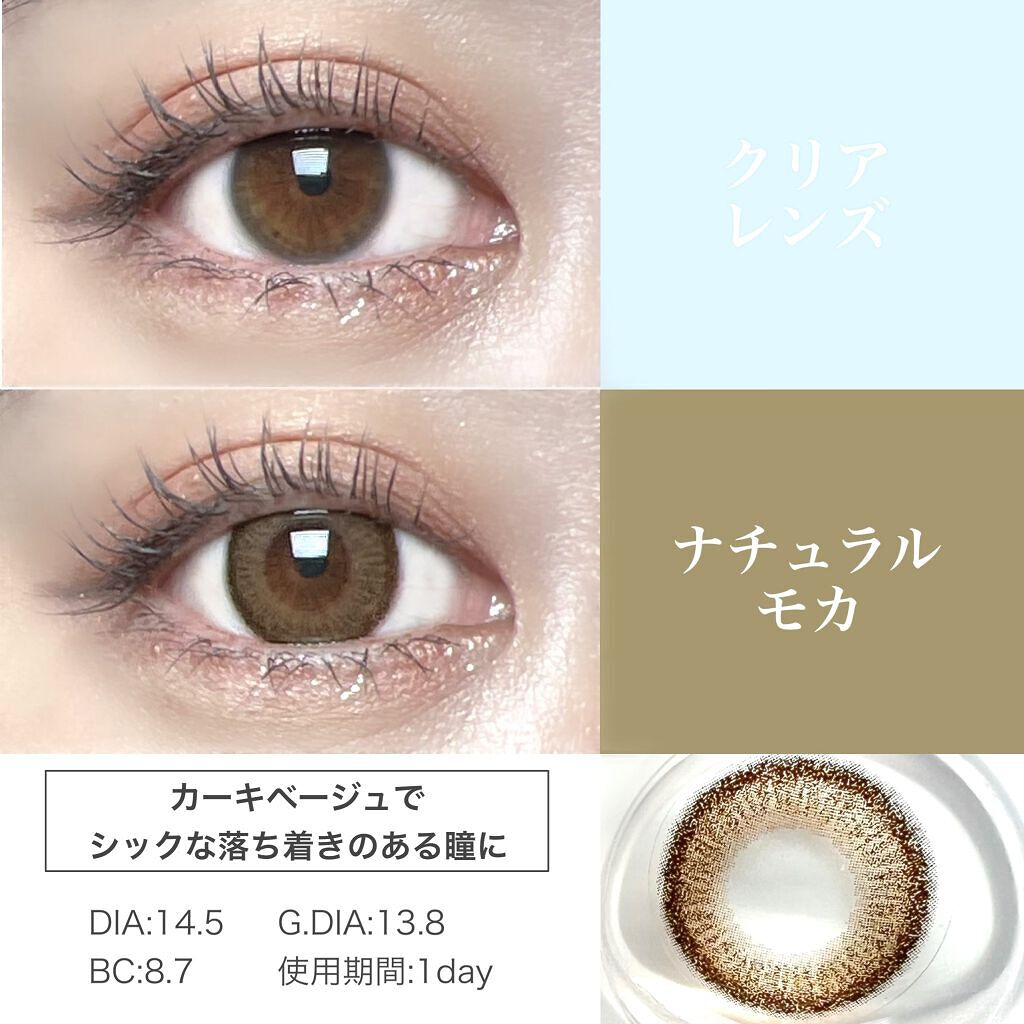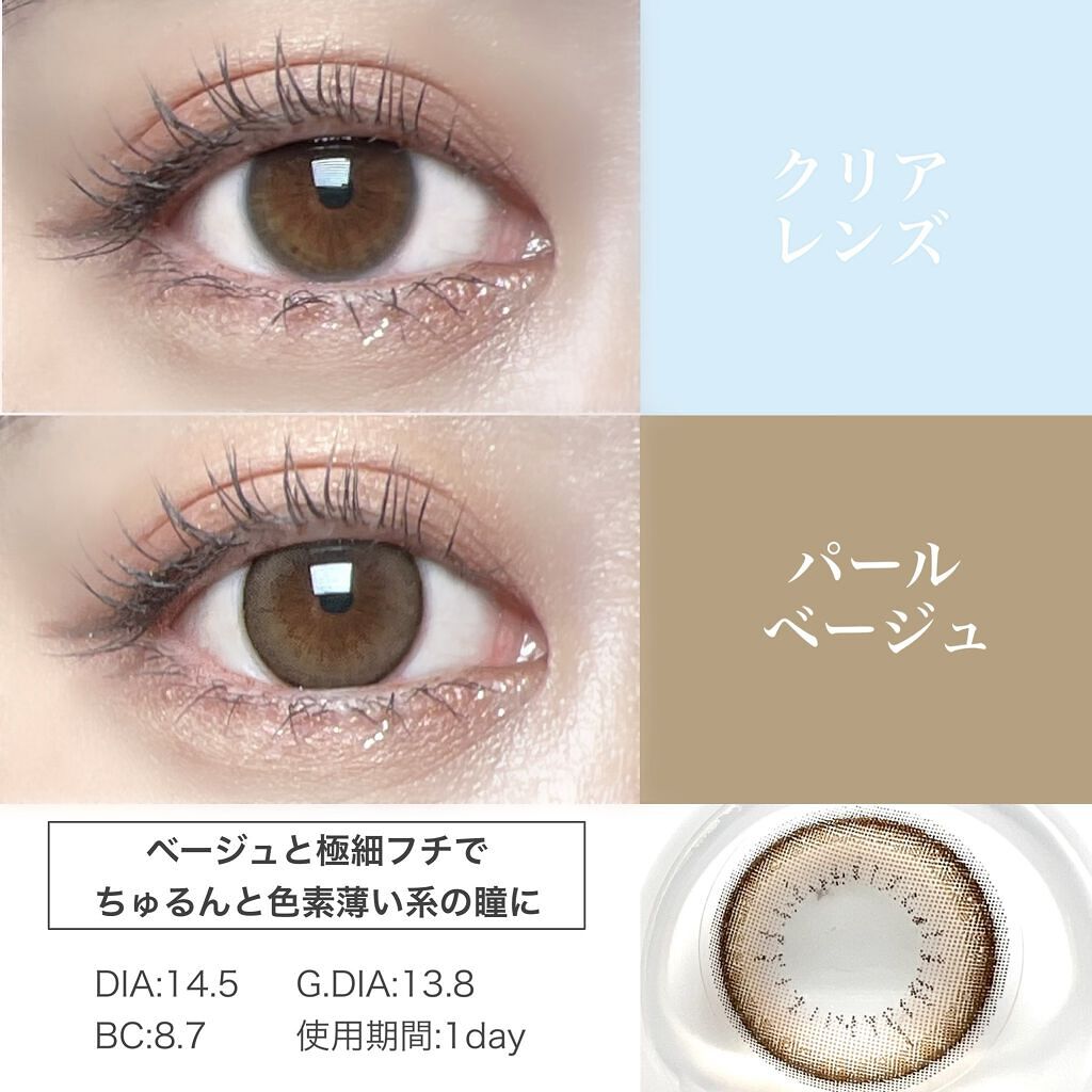 - ※2023年6月〜製品ラベルのデザインを一部変更いたします(順次切替予定)。尚これに係る商品の返品・交換等は承っておりません。 ”もっとバレずに盛れる” レンズデザインに極小ドットを採用することで、本来の瞳の色に溶け込むように馴染み、よりバレにくいナチュラルな仕上がりに。 ■パールスノーグレー(Pearl Snow Gray) ちゅるんとした絶妙グレーで透明感と抜け感のある瞳になれるデザイン。 ■テディモカ(Teddy Mocha) 甘モテ♡色っぽちゅるんオトナのミュートブラウン くりっと甘い盛り感で色気ただよう、ちゅるんな瞳 ■ミルクブラウニー(Milk Brownie) “ナチュ盛り♡ふわちゅるん”ピュアなブラウンベージュ 柔らかなミルクブラウンで甘さたっぷり、ピュアな瞳 DIA:14.5mm BC:8.7mm 中心厚:0.08mm( -3.00D ) 含水率: 38.6%(※ナチュラルブラウン、シャンパンブラウン、ナチュラルブラック) 42.5%(※アプリコットブラウン・ナチュラルモカ・クラシックチーク・クリアキャメル・パールベージュ・スムースコーラル・くぎづけの心・ひとめぼれの恋・パールスノーグレー・テディモカ ・ミルクブラウニー) カラーコンタクトレンズの不適正使用による眼障害の危険性等などがあります。 ●コンタクトレンズは高度管理医療機器です。不十分な洗浄・消毒など不適切なケアや、長時間・交換期間を超えた装用により、アレルギー性結膜炎、角膜感染症、角膜潰瘍等の重篤な眼障害が発生する危険性があります ●ご使用前に取扱説明書を確認してください 使用上の留意事項 ●眼科医院等を受診してからお求めください ●眼に異常を感じたら直ちにレンズ使用を中止し、お近くの眼科等で診察を受けてください ●医師の指示にしたがってご使用ください ●コンタクトレンズを装用する場合、自覚症状がなくても、眼科医院等での定期検査を受けてください ●レンズに不具合がある場合は使用しないでください