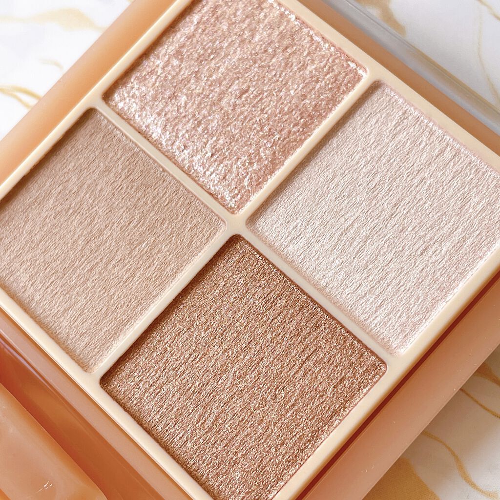 - ラメ・パール・マット3質感の4色アイシャドウ。 肌馴染みの良いベージュを基調としたカラー。ラメ・パール・マットの3質感を重ねて、自然にまぶたを強調し奥行のある大きな目元へ。 しっとり溶け込むような柔らかなパウダーなので、スルスル伸びてまぶたにピタッと密着。保湿成分(スクワラン・ホホバ種子油)配合。