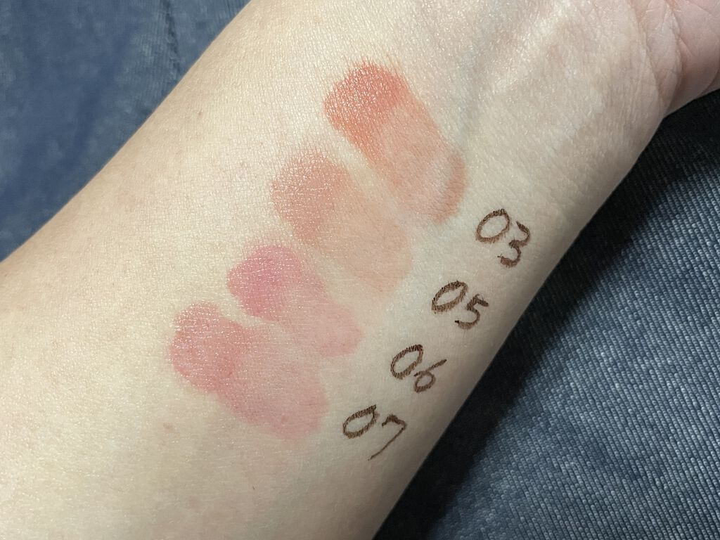 このティント、塗ってから5分んまんませずに定着させるというもの しっかり定着させると落ちにくく、写真を撮った後にウエットティッシュでだいぶ擦りましたが腕にうっすら残ってます…🤣笑 パケも可愛くてプチプラっぽくない見た目、色味もそれぞれ可愛くて落ちにくい!