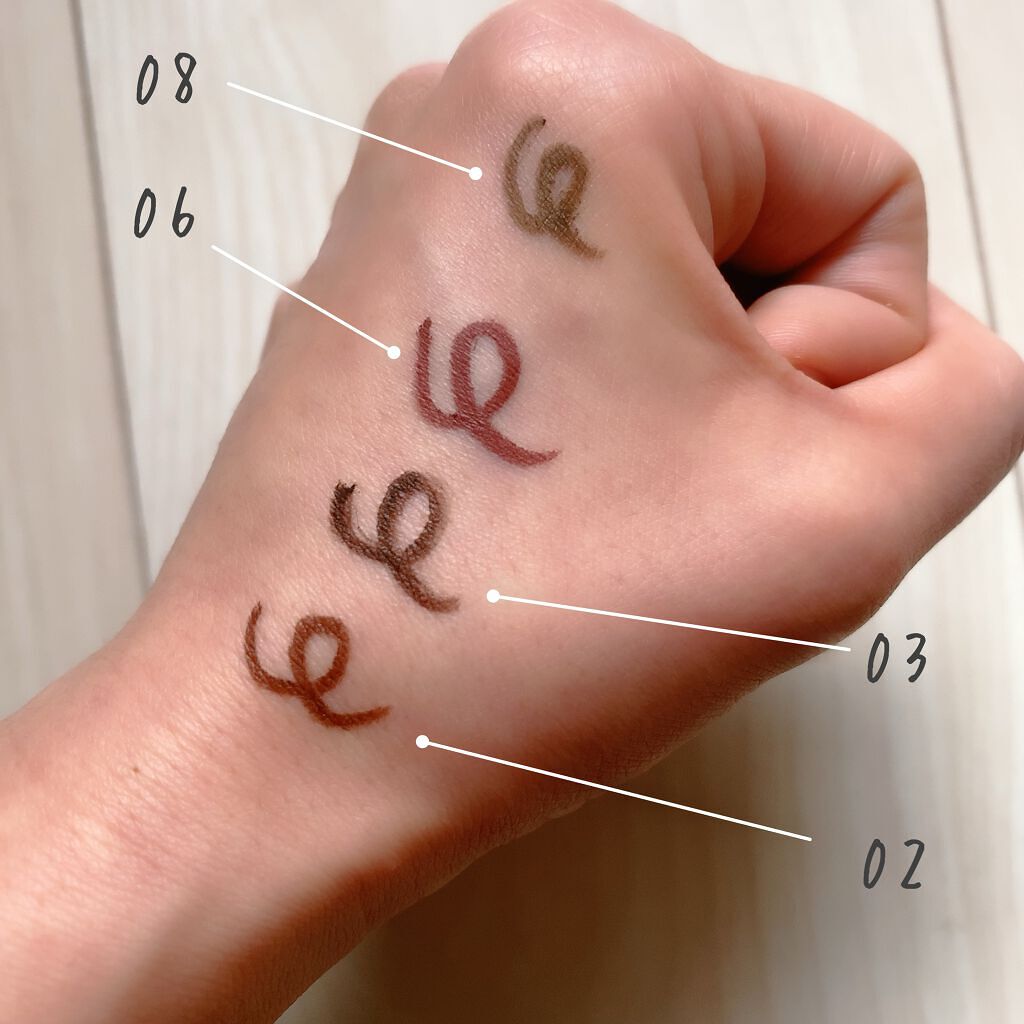 - <01 ディープブラック> メチルトリメチコン、トリメチルシロキシケイ酸、(アクリレーツ/アクリル酸ステアリル/メタクリル酸ジメチコン)コポリマー、ポリエチレン、カルナウバロウ、キャンデリラロウ、ジメチコン、水添レシチン、シリカ、メタクリル酸メチルクロスポリマー、トコフェロール、スクワラン、ホホバ種子油、マカデミア種子油、ヒアルロン酸Na、メチコン、(+/-)水酸化Al、酸化鉄、マイカ、酸化チタン <02 ミディアムブラウン> メチルトリメチコン、トリメチルシロキシケイ酸、(アクリレーツ/アクリル酸ステアリル/メタクリル酸ジメチコン)コポリマー、ポリエチレン、カルナウバロウ、キャンデリラロウ、ジメチコン、水添レシチン、シリカ、メタクリル酸メチルクロスポリマー、トコフェロール、スクワラン、ホホバ種子油、マカデミア種子油、ヒアルロン酸Na、メチコン、(+/-)水酸化Al、酸化鉄、マイカ、酸化チタン <03 ダークブラウン> メチルトリメチコン、トリメチルシロキシケイ酸、(アクリレーツ/アクリル酸ステアリル/メタクリル酸ジメチコン)コポリマー、ポリエチレン、カルナウバロウ、スクワラン、ジメチコン、水添レシチン、シリカ、トコフェロール、メタクリル酸メチルクロスポリマー、キャンデリラロウ、ホホバ種子油、マカデミア種子油、ヒアルロン酸Na、メチコン、水酸化Al、酸化鉄、酸化チタン、マイカ <04 ガーネットバーガンディ> メチルトリメチコン、トリメチルシロキシケイ酸、(アクリレーツ/アクリル酸ステアリル/メタクリル酸ジメチコン)コポリマー、ポリエチレン、カルナウバロウ、ジメチコン、キャンデリラロウ、水添レシチン、シリカ、トコフェロール、メタクリル酸メチルクロスポリマー、スクワラン、ホホバ種子油、マカデミア種子油、ヒアルロン酸Na、メチコン、水酸化Al、酸化鉄、グンジョウ、酸化チタン、マイカ <06 フォギープラム> メチルトリメチコン、トリメチルシロキシケイ酸、(アクリレーツ/アクリル酸ステアリル/メタクリル酸ジメチコン)コポリマー、ポリエチレン、カルナウバロウ、ジメチコン、キャンデリラロウ、水酸化Al、水添レシチン、シリカ、トコフェロール、メタクリル酸メチルクロスポリマー、スクワラン、ホホバ種子油、マカデミア種子油、ヒアルロン酸Na、メチコン、酸化鉄、グンジョウ、酸化チタン、マイカ <07 アズキブラウン> メチルトリメチコン、トリメチルシロキシケイ酸、(アクリレーツ/アクリル酸ステアリル/メタクリル酸ジメチコン)コポリマー、ポリエチレン、カルナウバロウ、キャンデリラロウ、ジメチコン、水添レシチン、シリカ、トコフェロール、メタクリル酸メチルクロスポリマー、スクワラン、ホホバ種子油、マカデミア種子油、水酸化Al、ハイドロゲンジメチコン、ヒアルロン酸Na、メチコン、酸化鉄、グンジョウ、マイカ、酸化チタン <09 ダージリンピンク> メチルトリメチコン、トリメチルシロキシケイ酸、(アクリレーツ/アクリル酸ステアリル/メタクリル酸ジメチコン)コポリマー、合成ワックス、カルナウバロウ、キャンデリラロウ、ジメチコン、水酸化Al、ハイドロゲンジメチコン、水添レシチン、シリカ、トコフェロール、メタクリル酸メチルクロスポリマー、スクワラン、ホホバ種子油、マカデミア種子油、ヒアルロン酸Na、メチコン、酸化鉄、酸化チタン、マイカ、グンジョウ <11 クラウディーグレー> メチルトリメチコン、トリメチルシロキシケイ酸、(アクリレーツ/アクリル酸ステアリル/メタクリル酸ジメチコン)コポリマー、合成ワックス、カルナウバロウ、ジメチコン、キャンデリラロウ、水酸化Al、水添レシチン、シリカ、トコフェロール、メタクリル酸メチルクロスポリマー、ハイドロゲンジメチコン、スクワラン、ホホバ種子油、マカデミア種子油、ヒアルロン酸Na、メチコン、酸化鉄、酸化チタン、マイカ <15 カプチーノピンク> メチルトリメチコン、トリメチルシロキシケイ酸、(アクリレーツ/アクリル酸ステアリル/メタクリル酸ジメチコン)コポリマー、合成ワックス、カルナウバロウ、ジメチコン、キャンデリラロウ、水酸化Al、水添レシチン、シリカ、トコフェロール、メタクリル酸メチルクロスポリマー、スクワラン、ホホバ種子油、マカデミア種子油、ヒアルロン酸Na、メチコン、酸化チタン、酸化鉄、マイカ <05 ビターキャラメル> メチルトリメチコン、トリメチルシロキシケイ酸、(アクリレーツ/アクリル酸ステアリル/メタクリル酸ジメチコン)コポリマー、ポリエチレン、カルナウバロウ、ジメチコン、キャンデリラロウ、水添レシチン、シリカ、トコフェロール、メタクリル酸メチルクロスポリマー、スクワラン、ホホバ種子油、マカデミア種子油、ヒアルロン酸Na、メチコン、水酸化Al、酸化鉄、マイカ、酸化チタン <08 マッチャカーキ> メチルトリメチコン、トリメチルシロキシケイ酸、(アクリレーツ/アクリル酸ステアリル/メタクリル酸ジメチコン)コポリマー、合成ワックス、