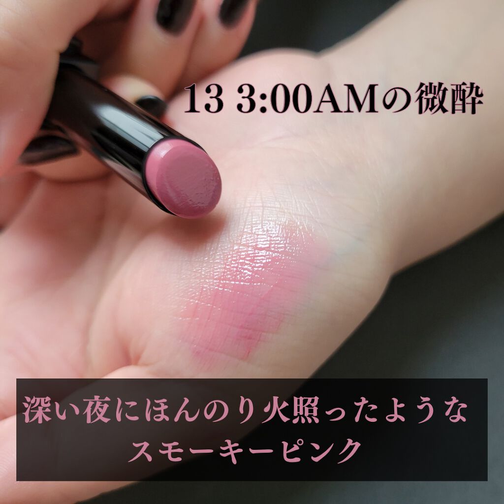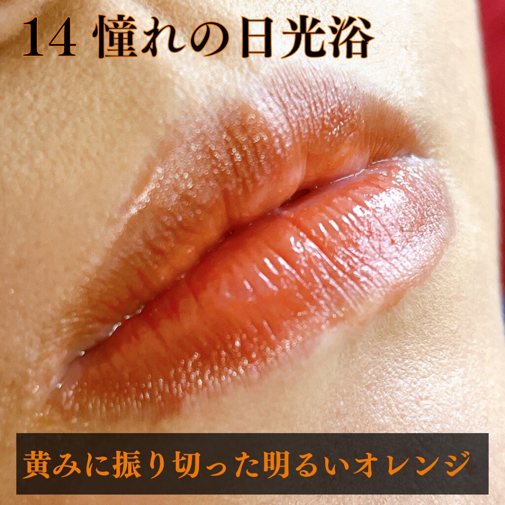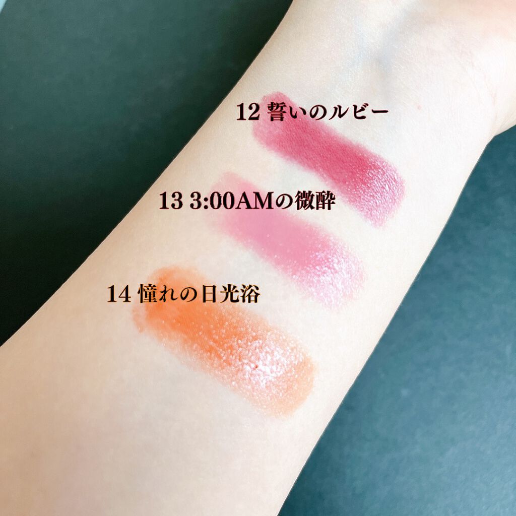 12 誓いのルビーは透け感のある青みのレッドで16タイプだと#クールサマー #クリアウィンター #クールウィンター におすすめ✨クールウィンターの人はナチュラル発色だからデイリーリップとして使いやすそう◎ 13 3:00AMの微酔は青みよりの明るいピンクでイチオシはサマー!発色も強すぎないから16タイプだと#ライトサマー #ブライトサマー におすすめ✨スモーキーピンクって説明にはあったけどくすみはそんなに気にならなかったよ🙆♀️ 14 憧れの日光浴はイエベさんこんなの待ってたんじゃない!?って感じの黄みに振り切った明るいオレンジ!16タイプだと#ブライトスプリング #ウォームスプリング に激推し✨