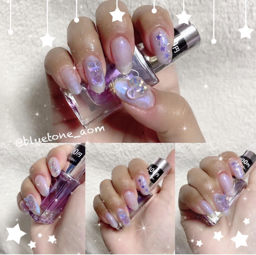 ラメがしっかりしてるし クリアカラーが入ってるから オーロラパウダー無しでも 充分キラキラしました! 反射強めのフィルムなので 実物はもっと うるうるとキラキラが強いです! ビー玉みたい🥺 ネイルシール長持ちさせたいけど ちょっと飽きてきたな〜って時とかに 全然違った印象になるのでオススメです! Seriaのベースジェル 本当にうるうるネイルしやすいので オススメしたい🙆♀️