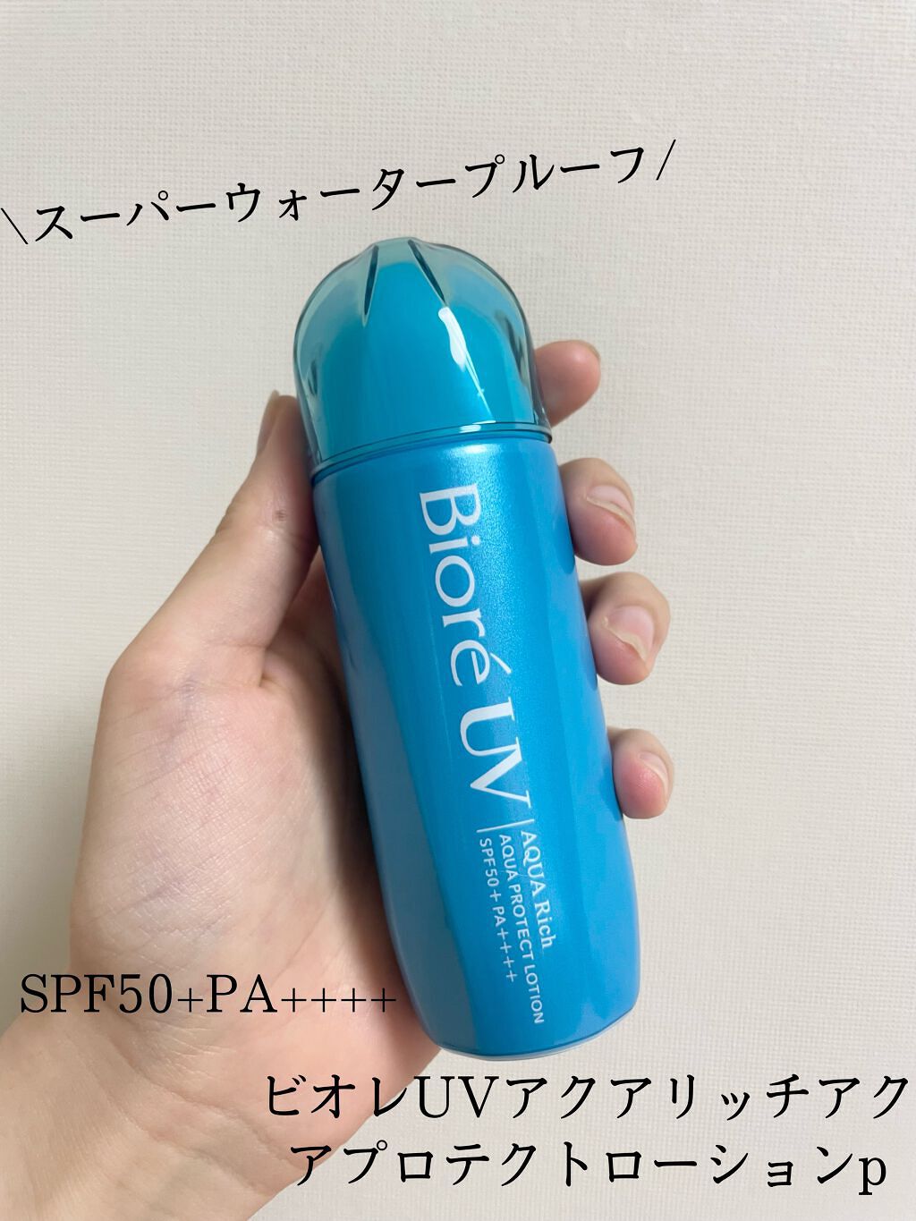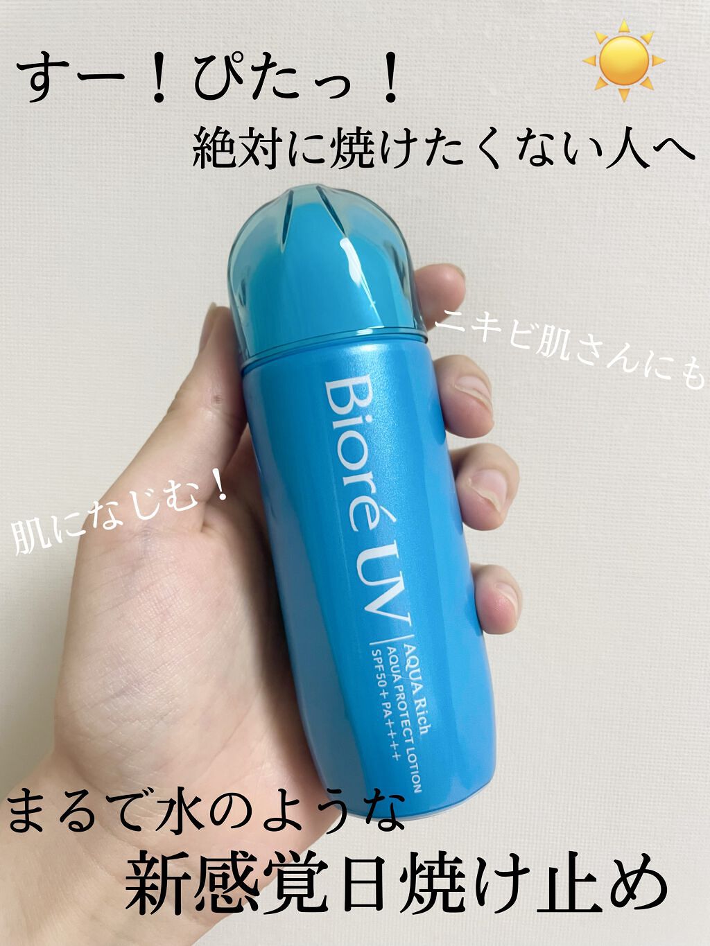 ビオレUVアクアリッチアクアプロテクトローションを使ってみたよ🩵SPF50+PA++++顔とからだ両方使用可!メイクのりをUPさせてくれて、水光肌みたいなツヤ感も出るから気に入ってる🩵UVカット成分が含まれたアクアカプセルが入ってるよ✨想像よ...