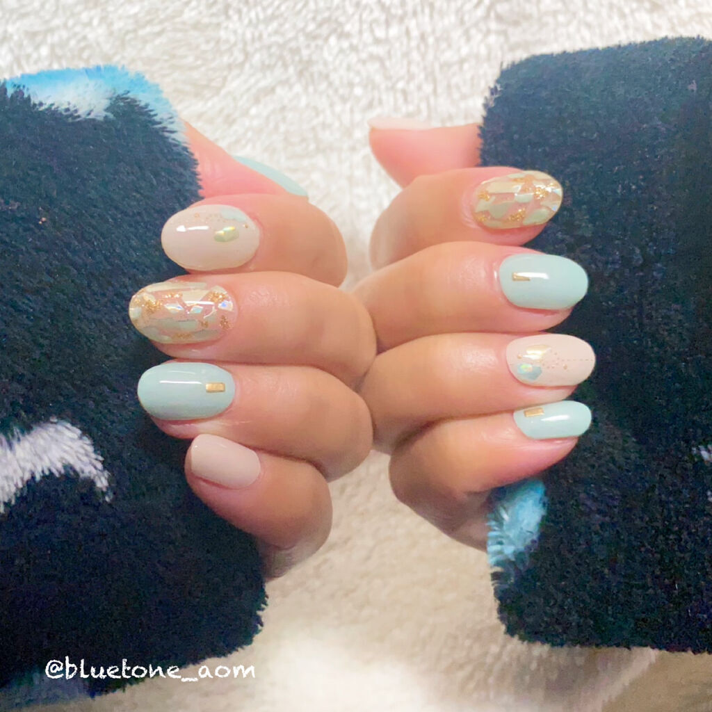 ラメがしっかりしてるし クリアカラーが入ってるから オーロラパウダー無しでも 充分キラキラしました! 反射強めのフィルムなので 実物はもっと うるうるとキラキラが強いです! ビー玉みたい🥺 ネイルシール長持ちさせたいけど ちょっと飽きてきたな〜って時とかに 全然違った印象になるのでオススメです! Seriaのベースジェル 本当にうるうるネイルしやすいので オススメしたい🙆♀️