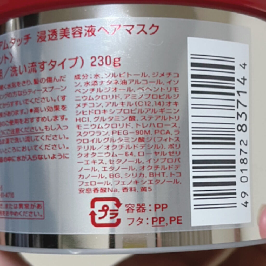 - <本体230g> 水、ソルビトール、ジメチコン、水添ナタネ油アルコール、イソペンチルジオール、ベヘントリモニウムクロリド、アミノプロピルジメチコン、アルキル(C12、14)オキシヒドロキシプロピルアルギニンHCl、ステアリルジヒドロキシプロピルジモニウムオリゴ糖、グルタミン酸、トレハロース、スクワラン、ステアルトリモニウムクロリド、PEG-90M、PCA、ラウロイルグルタミン酸ジ(フィトステリル/オクチルドデシル)、加水分解コムギタンパク、ポリクオタニウム-64、加水分解コムギデンプン、ローヤルゼリーエキス、イソプロパノール、セタノール、オクチルドデカノール、エタノール、PG、BG、トコフェロール、フェノキシエタノール、安息香酸Na、香料、黄5 <つめかえ用700g> 水、ソルビトール、ジメチコン、水添ナタネ油アルコール、イソペンチルジオール、ベヘントリモニウムクロリド、アミノプロピルジメチコン、アルキル(C12、14)オキシヒドロキシプロピルアルギニンHCl、ステアリルジヒドロキシプロピルジモニウムオリゴ糖、グルタミン酸、トレハロース、スクワラン、ステアルトリモニウムクロリド、PEG-90M、PCA、ラウロイルグルタミン酸ジ(フィトステリル/オクチルドデシル)、加水分解コムギタンパク、ポリクオタニウム-64、加水分解コムギデンプン、ローヤルゼリーエキス、イソプロパノール、セタノール、オクチルドデカノール、エタノール、PG、BG、トコフェロール、フェノキシエタノール、安息香酸Na、香料、黄5 <ピンクリボン(230g)> シリカ、水、BG、ジメチコン、ソルビトール、フェノキシエタノール、スクワラン、香料、トコフェロール、エタノール、ローヤルゼリーエキス、セタノール、トレハロース、イソペンチルジオール、イソプロパノール、ベヘントリモニウムクロリド、ポリクオタニウム-64、PCA、PEG-90M、黄5、BHT、ラウロイルグルタミン酸ジ(フィトステリル/オクチルドデシル)、水添ナタネ油アルコール、グルタミン酸、オクチルドデカノール、安息香酸Na、ステアルトリモニウムクロリド、アミノプロピルジメチコン、アルキル(C12、14)オキシヒドロキシプロピルアルギニンHCI