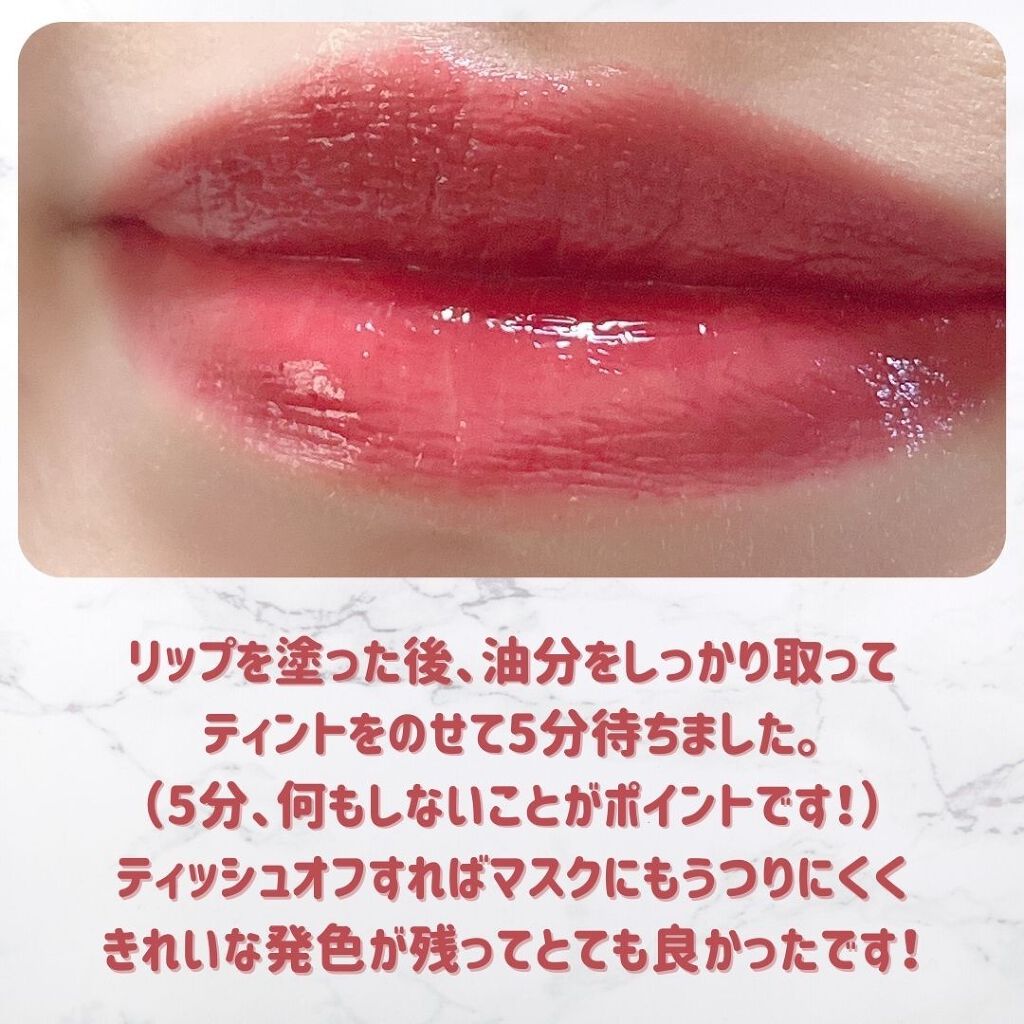 - ツヤ膜でLIPカラーを閉じ込める 塗ってから「5分」でかわいい唇完成♥ツヤがあふれ出るオイルinウォーターティント 水に対して約2倍のオイル成分を配合した「オイルinウォーター処方」 時間経過でツヤ膜がじゅわ~っとあふれ出し、 まるでグロスを重ねたような仕上がりに。みずみずしいツヤ感が持続します。 塗布後、時間経過(※)で色が定着して食べても飲んでも血色長持ち。 (※定着には個人差があります。弊社5分推奨) 高密着で唇に溶け込むように色づきます。 コップやペットボトルへの色移りがしにくくなります。