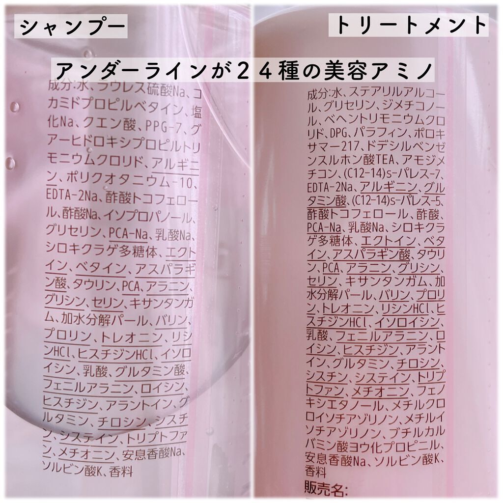 - <シャンプー ポンプ> 水、ラウレス硫酸Na、コカミドプロピルベタイン、塩化Na、クエン酸、PPG-7、グアーヒドロキシプロピルトリモニウムクロリド、アルギニン、ポリクオタニウム-10、EDTA-2Na、酢酸トコフェロール、酢酸Na、イソプロパノール、グリセリン、PCA-Na、乳酸Na、シロキクラゲ多糖体、エクトイン、ベタイン、アスパラギン酸、タウリン、PCA、アラニン、グリシン、セリン、キサンタンガム、加水分解パール、バリン、プロリン、トレオニン、リシンHCl、ヒスチジンHCl、イソロイシン、乳酸、グルタミン酸、フェニルアラニン、ロイシン、ヒスチジン、アラントイン、グルタミン、チロシン、シスチン、システイン、トリプトファン、メチオニン、安息香酸Na、ソルビン酸K、香料 <トリートメント ポンプ> 水、ステアリルアルコール、グリセリン、ジメチコノール、ベヘントリモニウムクロリド、DPG、パラフィン、ポロキサマー217、ドデシルベンゼンスルホン酸TEA、アモジメチコン、(C12-14)s-パレス-7、EDTA-2Na、アルギニン、グルタミン酸、(C12-14)s-パレス-5、酢酸トコフェロール、酢酸、PCA-Na、乳酸Na、シロキクラゲ多糖体、エクトイン、ベタイン、アスパラギン酸、タウリン、PCA、アラニン、グリシン、セリン、キサンタンガム、加水分解パール、バリン、プロリン、トレオニン、リシンHCl、ヒスチジンHCl、イソロイシン、乳酸、フェニルアラニン、ロイシン、ヒスチジン、アラントイン、グルタミン、チロシン、シスチン、システイン、トリプトファン、メチオニン、フェノキシエタノール、メチルクロロイソチアゾリノン、メチルイソチアゾリノン、ブチルカルバミン酸ヨウ化プロピニル、安息香酸Na、ソルビン酸K、香料 <シャンプーつめかえ用> 水、ラウレス硫酸Na、コカミドプロピルベタイン、塩化Na、クエン酸、PPG-7、グアーヒドロキシプロピルトリモニウムクロリド、アルギニン、ポリクオタニウム-10、EDTA-2Na、酢酸トコフェロール、酢酸Na、イソプロパノール、グリセリン、PCA-Na、乳酸Na、シロキクラゲ多糖体、エクトイン、ベタイン、アスパラギン酸、タウリン、PCA、アラニン、グリシン、セリン、キサンタンガム、加水分解パール、バリン、プロリン、トレオニン、リシンHCl、ヒスチジンHCl、イソロイシン、乳酸、グルタミン酸、フェニルアラニン、ロイシン、ヒスチジン、アラントイン、グルタミン、チロシン、シスチン、システイン、トリプトファン、メチオニン、安息香酸Na、ソルビン酸K、香料 <トリートメントつめかえ用> 水、ステアリルアルコール、グリセリン、ジメチコノール、ベヘントリモニウムクロリド、DPG、パラフィン、ポロキサマー217、ドデシルベンゼンスルホン酸TEA、アモジメチコン、(C12-14)s-パレス-7、EDTA-2Na、アルギニン、グルタミン酸、(C12-14)s-パレス-5、酢酸トコフェロール、酢酸、PCA-Na、乳酸Na、シロキクラゲ多糖体、エクトイン、ベタイン、アスパラギン酸、タウリン、PCA、アラニン、グリシン、セリン、キサンタンガム、加水分解パール、バリン、プロリン、トレオニン、リシンHCl、ヒスチジンHCl、イソロイシン、乳酸、フェニルアラニン、ロイシン、ヒスチジン、アラントイン、グルタミン、チロシン、シスチン、システイン、トリプトファン、メチオニン、フェノキシエタノール、メチルクロロイソチアゾリノン、メチルイソチアゾリノン、ブチルカルバミン酸ヨウ化プロピニル、安息香酸Na、ソルビン酸K、香料