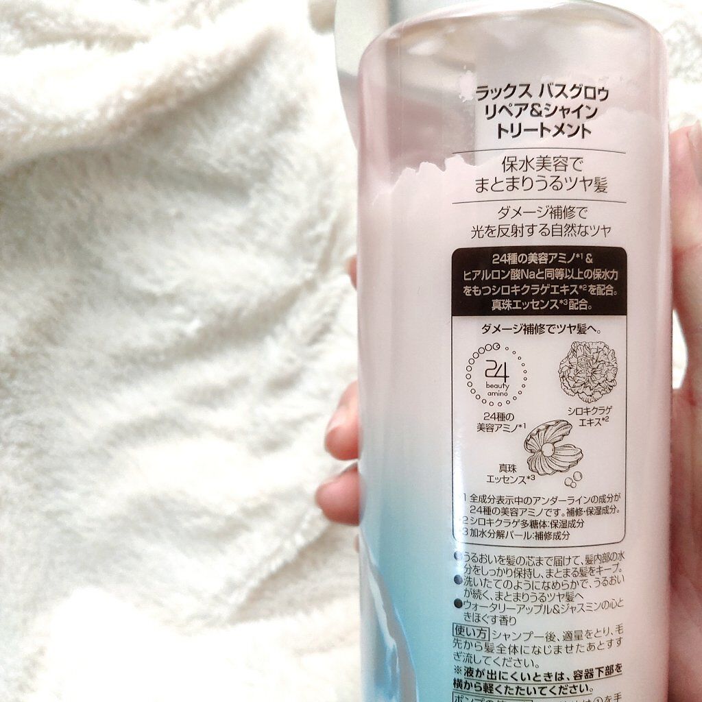 - 保水美容で、洗いたてのようなまとまるツヤ髪一日中続く。 「お風呂上りの髪のまとまりやツヤが一日続いてほしい」、という声から誕生した、バスグロウシリーズ。 24種の美容アミノ*1&ヒアルロン酸Na と同等以上の保水力をもつシロキクラゲエキス*2を配合。 うるおいを髪の芯まで届けて、髪内部の水分をしっかり保持し、まとまる髪をキープ。 ダメージが気になる方におすすめな、補修成分、真珠エッセンス*3を配合したリペア&シャインシリーズ。 光を反射する自然なツヤ髪へ導きます。 ウォータリーアップル&ジャスミンの心ときほぐす香り。 *1グルタミン酸、グリシン、ロイシン、ヒスチジンHCl、ヒスチジン、セリン、バリン、トレオニン、アラニン、イソロイシン、フェニルアラニン、アルギニン、プロリン、リシンHCl、アスパラギン酸、PCA-Na、PCA、エクトイン、チロシン、トリプトファン、メチオニン、ベタイン、システイン、シスチン:補修・保湿成分*2シロキクラゲ多糖体:保湿成分*3加水分解パール:補修成分