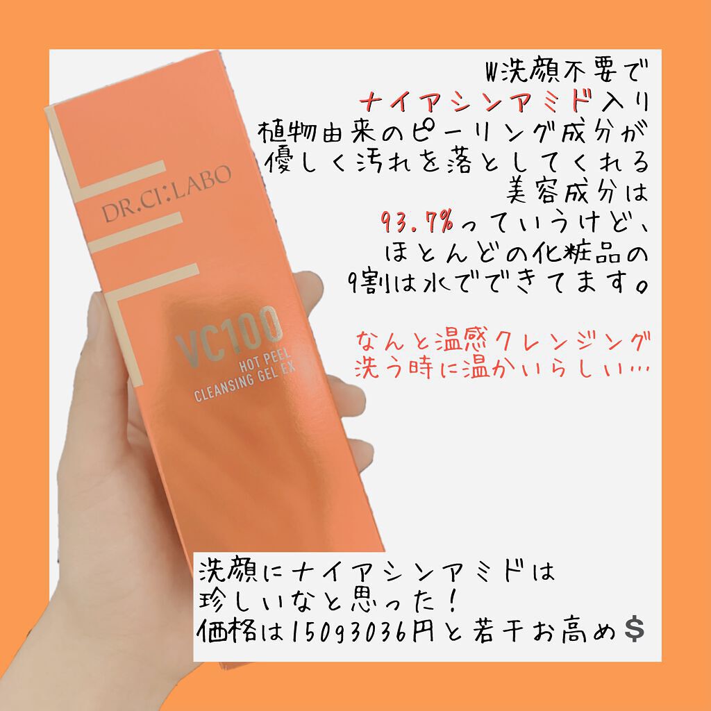 - リニューアル発売 処方アップグレード 史上最高※1、美容成分93. 7%※2配合の温感ゲルでメイクや毛穴奥の汚れ、黒ずみをしっかりオフ W洗顔不要の高機能クレンジング ビタミンC(APPS*1)配合。美容成分93.7%※2の毛穴対策温感クレンジング『VC100ホットピールクレンジングゲルEX』が、 クレンジング力と美容成分をパワーアップし、しっかり温感効果がうれしい美容液級のクレンジングへと進化をとげて新登場。 クレンジング・洗顔・ピーリング・温感マッサージ・温感パックの5つの機能を備えたW洗顔不要の高機能クレンジング洗顔です。 クレイ*2、2種のタンパク質分解酵素*3、植物由来のピーリング成分*4を含む温感ゲルが、肌にとろけるようになじみ、毛穴の奥に入り込んだメイク汚れや皮脂、不要な角質をしっかり吸着。ポイントメイクまでするんと落とす抜群のクレンジング力で、ツルッとなめらかで明るい洗いあがりを実現します。また、注目の高機能成分「ナイアシンアミド*5」や保湿成分*6など、史上最高※193.7%※2 配合の美容成分が、洗うたびにくすみ※4や初期エイジングのサイン※5を一掃、使うたびに肌表面がうるおいやハリで満たされる素肌に。 日中の肌を環境ストレス※6から守る「アルテロモナス発酵エキス*5」も新配合しました。 柑橘系のさわやかな香り。 無香料(植物由来の精油を使用)、無合成着色料、無鉱物油、パラベンフリー、アルコール無添加、石油系界面活性剤フリー。 ※1 ドクターシーラボにおいて ※2 当社調べ ※3 角層まで ※4 古い角質によりくすんで見えること ※5 年齢を重ねた肌 ※6 乾燥、紫外線 *1 パルミチン酸アスコルビルリン酸3Na(製品の抗酸化剤として) *2 モロッコ溶岩クレイ(洗浄成分) *3 プロテアーゼ、パパイン(洗浄成分)*4 ライム果汁、レモン果汁、グレープフルーツ果実エキス、オレンジ果汁、サンザシエキス、 ナツメ果実エキス、リンゴ果実エキス、乳酸桿菌/セイヨウナシ果汁発酵液(洗浄成分) *5 整肌成分