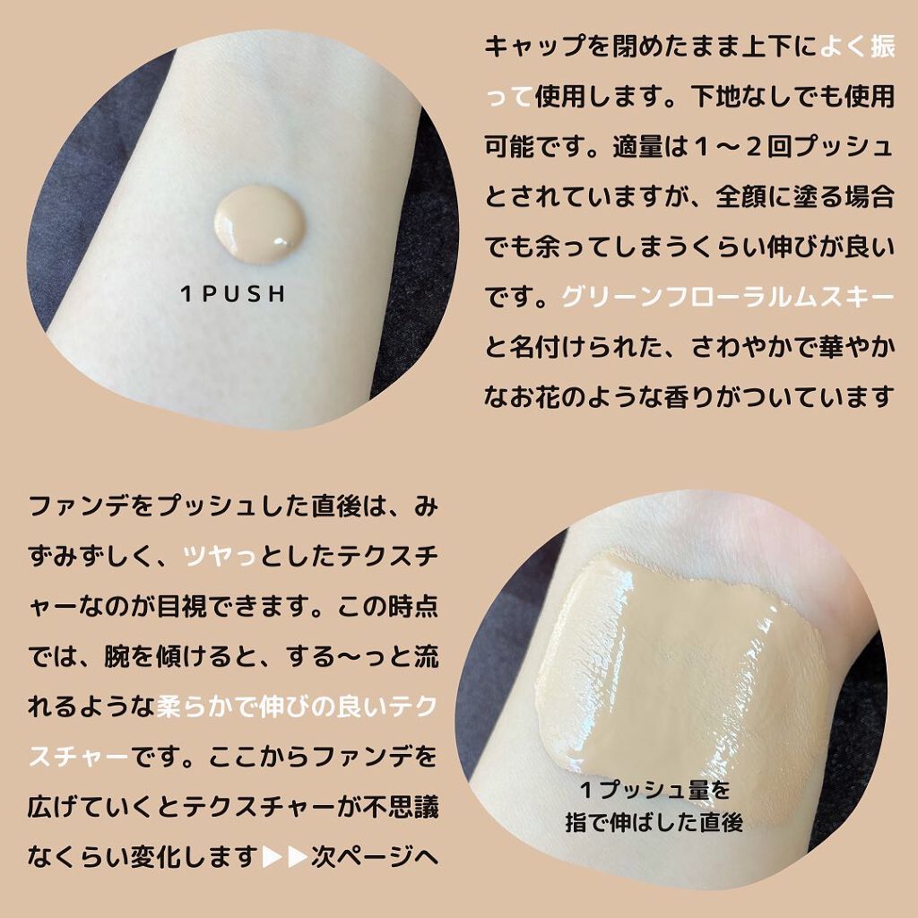 | リキッドファンデーションランキング第192位 | フレッシュグリーンフローラルの香り。ゆるめのテクスチャーでムラなくぬることができました。 | 詳細を見る |