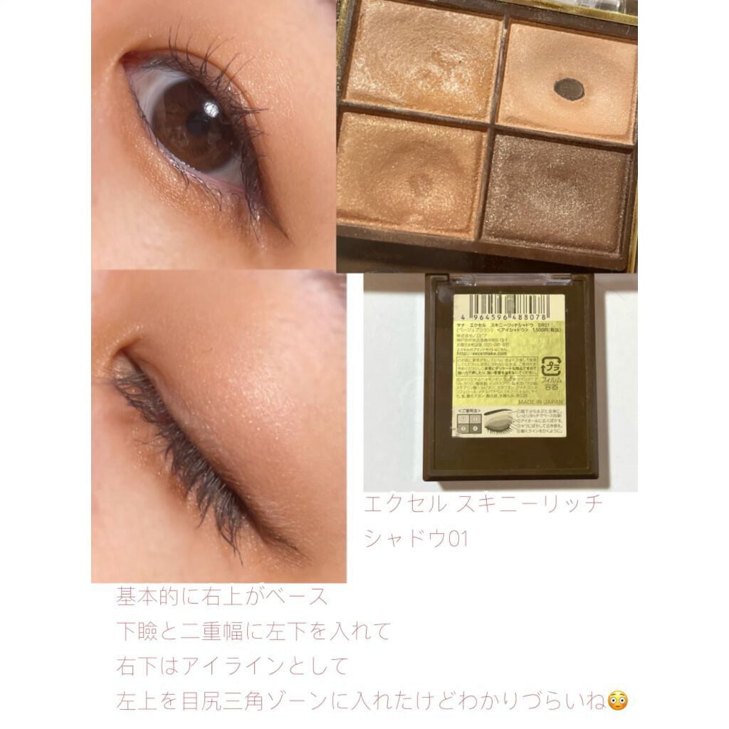 excelスキニーリッチシャドウSR03ロイヤルブラウンとっても有名で優秀なイメージがありずっと使いたいな〜と思っていたアイシャドウ肌馴染みの良いブラウンに繊細なパールのツヤ感が綺麗です✨ナチュラルな仕上がりだけど程良いメイク感と言うか、上品...