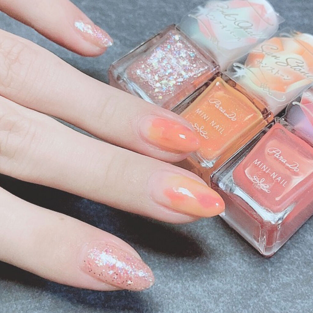 オレンジの誘惑に負けた🧡😍可愛すぎる!!ちふれのオレンジラメ🧡ちふれネイルエナメル017カラフルラメ可愛い、、マジで可愛すぎて夢中で塗ってたら、グラデーションしか出来なかった(笑)オレンジの微細なラメに、大きめゴールドのホロ⭐️塗るとシアーな...