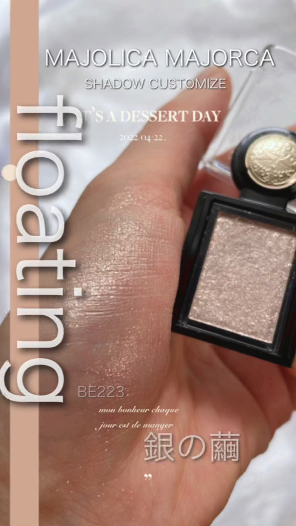 - 思いのままにカスタムできる 大粒ラメがきらめくアイシャドウ ○輝度の高い大粒ラメが密着しラメ落ちしないから、瞳全体輝きを増してより華やかな印象が続く -フローティングベース処方 ○ラメがチラチラ浮いているように輝き、華やかに、そして立体感のある目もとへ。 【色調】 〈フローティング:大粒ラメがチラチラ浮いているように見える仕上がり〉