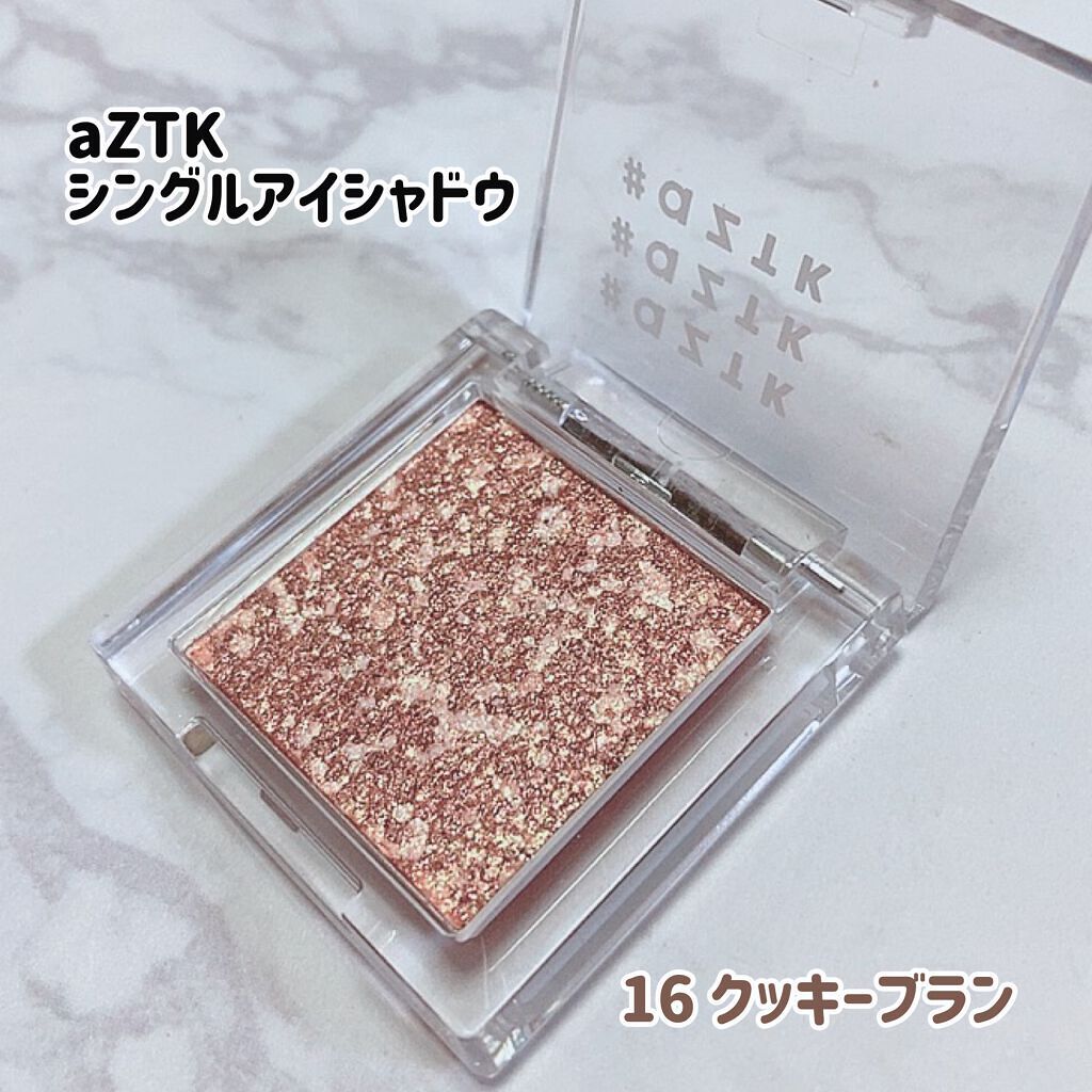 #aZTKシングルアイシャドウも何個か買いました シングルアイシャドウは¥330と激安!! 挑戦したいけど…って思ってたカラーも手が出しやすいお値段で嬉しいです^ - ^ 微粒子の細かいパウダーは広げやすく飛びにくいので初心者さんでも使いやすいです🥰 16クッキーブランはゴールドラメがキラキラでイエベさんに映えそーなカラーです(^-^)❣️ ブラウンだから普段使いもしやすいし、これ一個でメイク完了してもめちゃくちゃ盛れるのでおすすめ〜🧡