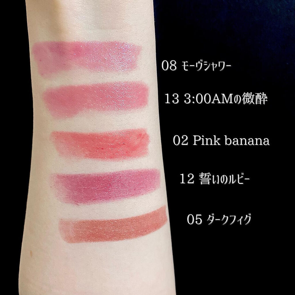 - <01 欲望の塊> テトライソステアリン酸ジペンタエリスリチル、トリ(カプリル酸/カプリン酸)グリセリル、オクチルドデカノール、ラウロイルグルタミン酸ジ(フィトステリル/オクチルドデシル)、ビスアルキル(C16-18)グリセリルウンデシルジメチコン、イソノナン酸イソトリデシル、水添ポリイソブテン、ラウロイルグルタミン酸ジ(オクチルドデシル/フィトステリル/ベヘニル)、パラフィン、合成ワックス、ダイマージリノール酸(フィトステリル/イソステアリル/セチル/ステアリル/ベヘニル)、マイクロクリスタリンワックス、水添マイクロクリスタリンワックス、ヒドロキシステアリン酸エチルヘキシル、トコフェロール、ホホバ種子油、オリーブ果実油、アーモンド油、(エチレン/プロピレン)コポリマー、ポリエチレン、ジメチコン、(+/-)(チタン/酸化チタン)焼結物、マイカ、ラウロイルアスパラギン酸Na、ラウロイルリシン、塩化亜鉛、酸化チタン、酸化鉄、水酸化Al、硫酸Ba、トリイソステアリン酸イソプロピルチタン、酸化スズ、ホウケイ酸(Ca/Al)、合成フルオロフロゴパイト、黄4、黄5、赤104(1)、赤201、赤202 <02 ピンクバナナ> テトライソステアリン酸ジペンタエリスリチル、トリ(カプリル酸/カプリン酸)グリセリル、オクチルドデカノール、ラウロイルグルタミン酸ジ(フィトステリル/オクチルドデシル)、ビスアルキル(C16-18)グリセリルウンデシルジメチコン、イソノナン酸イソトリデシル、水添ポリイソブテン、ラウロイルグルタミン酸ジ(オクチルドデシル/フィトステリル/ベヘニル)、パラフィン、合成ワックス、ダイマージリノール酸(フィトステリル/イソステアリル/セチル/ステアリル/ベヘニル)、マイクロクリスタリンワックス、水添マイクロクリスタリンワックス、ヒドロキシステアリン酸エチルヘキシル、トコフェロール、ホホバ種子油、オリーブ果実油、アーモンド油、(エチレン/プロピレン)コポリマー、ポリエチレン、ジメチコン、(+/-)(チタン/酸化チタン)焼結物、マイカ、ラウロイルアスパラギン酸Na、ラウロイルリシン、塩化亜鉛、酸化チタン、酸化鉄、水酸化Al、硫酸Ba、トリイソステアリン酸イソプロピルチタン、酸化スズ、ホウケイ酸(Ca/Al)、合成フルオロフロゴパイト、黄4、黄5、赤104(1)、赤201、赤202 <03 陽炎> テトライソステアリン酸ジペンタエリスリチル、トリ(カプリル酸/カプリン酸)グリセリル、オクチルドデカノール、ラウロイルグルタミン酸ジ(フィトステリル/オクチルドデシル)、ビスアルキル(C16-18)グリセリルウンデシルジメチコン、イソノナン酸イソトリデシル、水添ポリイソブテン、ラウロイルグルタミン酸ジ(オクチルドデシル/フィトステリル/ベヘニル)、パラフィン、合成ワックス、ダイマージリノール酸(フィトステリル/イソステアリル/セチル/ステアリル/ベヘニル)、マイクロクリスタリンワックス、水添マイクロクリスタリンワックス、ヒドロキシステアリン酸エチルヘキシル、トコフェロール、ホホバ種子油、オリーブ果実油、アーモンド油、(エチレン/プロピレン)コポリマー、ポリエチレン、ジメチコン、(+/-)(チタン/酸化チタン)焼結物、マイカ、ラウロイルアスパラギン酸Na、ラウロイルリシン、塩化亜鉛、酸化チタン、酸化鉄、水酸化Al、硫酸Ba、トリイソステアリン酸イソプロピルチタン、酸化スズ、ホウケイ酸(Ca/Al)、合成フルオロフロゴパイト、黄4、黄5、赤104(1)、赤201、赤202 <04 パンプキンワイン> テトライソステアリン酸ジペンタエリスリチル、トリ(カプリル酸/カプリン酸)グリセリル、オクチルドデカノール、ラウロイルグルタミン酸ジ(フィトステリル/オクチルドデシル)、ビスアルキル(C16-18)グリセリルウンデシルジメチコン、イソノナン酸イソトリデシル、水添ポリイソブテン、ラウロイルグルタミン酸ジ(オクチルドデシル/フィトステリル/ベヘニル)、パラフィン、合成ワックス、ダイマージリノール酸(フィトステリル/イソステアリル/セチル/ステアリル/ベヘニル)、マイクロクリスタリンワックス、水添マイクロクリスタリンワックス、ヒドロキシステアリン酸エチルヘキシル、トコフェロール、ホホバ種子油、オリーブ果実油、アーモンド油、(エチレン/プロピレン)コポリマー、ポリエチレン、ジメチコン、(+/-)(チタン/酸化チタン)焼結物、マイカ、ラウロイルアスパラギン酸Na、ラウロイルリシン、塩化亜鉛、酸化チタン、酸化鉄、水酸化Al、硫酸Ba、トリイソステアリン酸イソプロピルチタン、酸化スズ、ホウケイ酸(Ca/Al)、合成フルオロフロゴパイト、黄4、黄5、赤104(1)、赤201、赤202 <05 ダークフィグ> テトライソステアリン酸ジペンタエリスリチル、トリ(カプリル酸/カプリン酸)グリセリル、オクチルドデカノール、ラウロイルグルタミン酸ジ(フィトステリル/オクチルドデシル)、ビスアルキル(C16-18)グリセリルウンデシルジメチコン、イソノナン酸イソトリデシル、水添ポリイソブテン、ラウロイルグルタミン酸ジ(オクチルドデシル/フィトステリル/ベヘニル)、