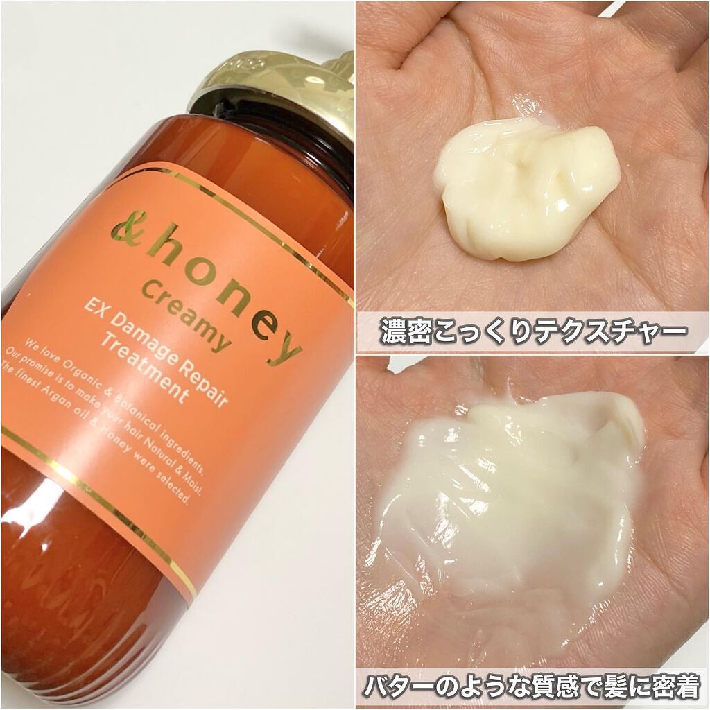 &honeyCreamyEXダメージリペアシャンプー1.0ヘアトリートメント2.0【詰替用】アエナで2つ合わせて、約800円ほどで購入しました!●シャンプーモッタリとした重めのテクスチャです。甘い香りがするので、最初は少しキツかったです。持続...